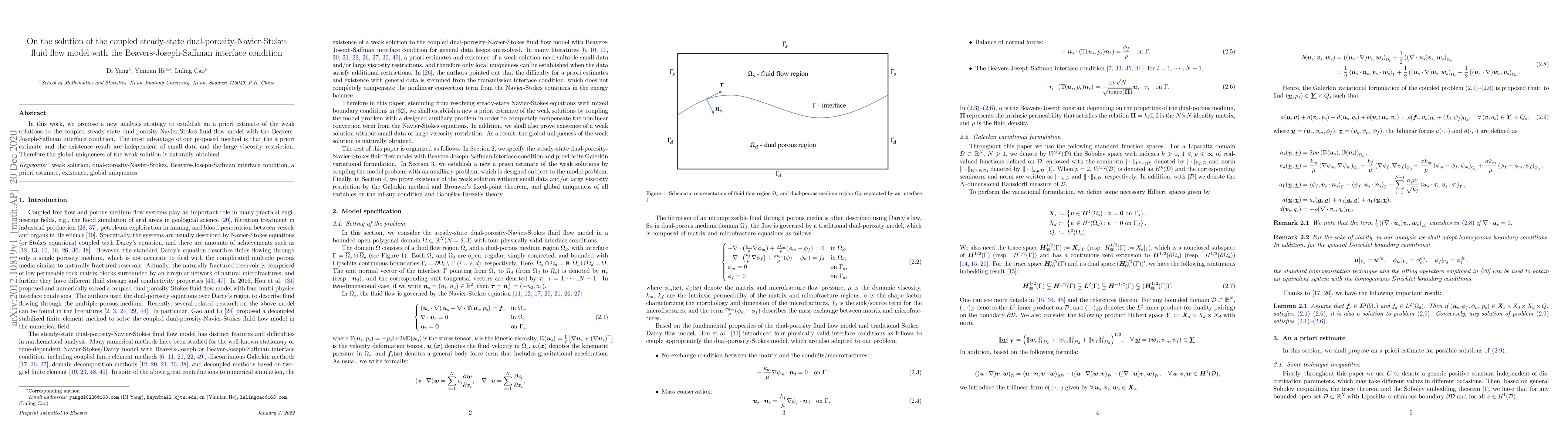 In this work, we propose a new analysis strategy to establish an a priori estimate of the weak solutions to the coupled steady-state dual-porosity-Navier-Stokes fluid flow model with the Beavers-Joseph-Saffman interface condition. The most advantage of our proposed method is that the a priori estimate and the existence result are independent of small data and the large viscosity restriction. Therefore the global uniqueness of the weak solution is naturally obtained.