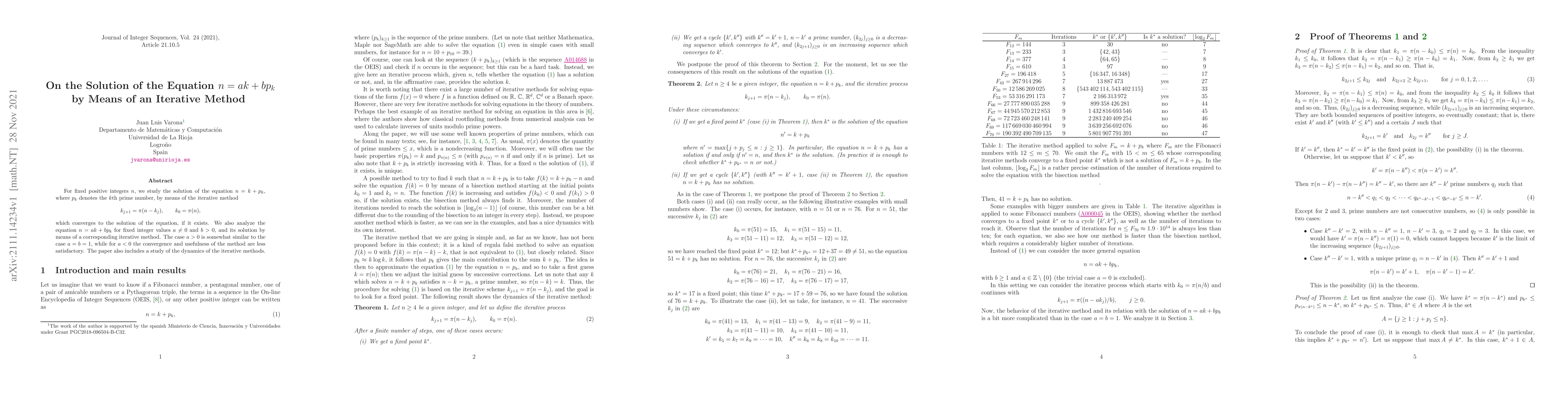 For fixed positive integers $n$, we study the solution of the equation $n = k + p_k$, where $p_k$ denotes the $k$th prime number, by means of the iterative method \[ k_{j+1} = \pi(n-k_j), \qquad k_0 = \pi(n), \] which converges to the solution of the equation, if it exists. We also analyze the equation $n = ak + bp_k$ for fixed integer values $a \ne 0$ and $b>0$, and its solution by means of a corresponding iterative method. The case $a>0$ is somewhat similar to the case $a=b=1$, while for $a<0$ the convergence and usefulness of the method are less satisfactory. The paper also includes a study of the dynamics of the iterative methods.