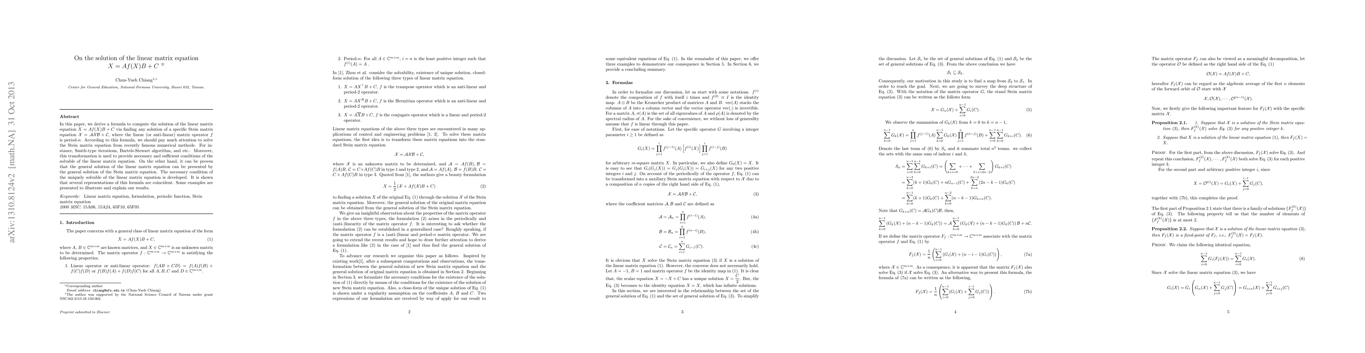 This paper derives a formula for solving the linear matrix equation $X=Af(X)B+C$ by transforming it into a specific Stein matrix equation $\mathcal{X}=\mathcal{A} \mathcal{X} \mathcal{B}+\mathcal{C}$. It discusses numerical methods for solving the Stein matrix equation and provides necessary and sufficient conditions for the solvability of the original equation.