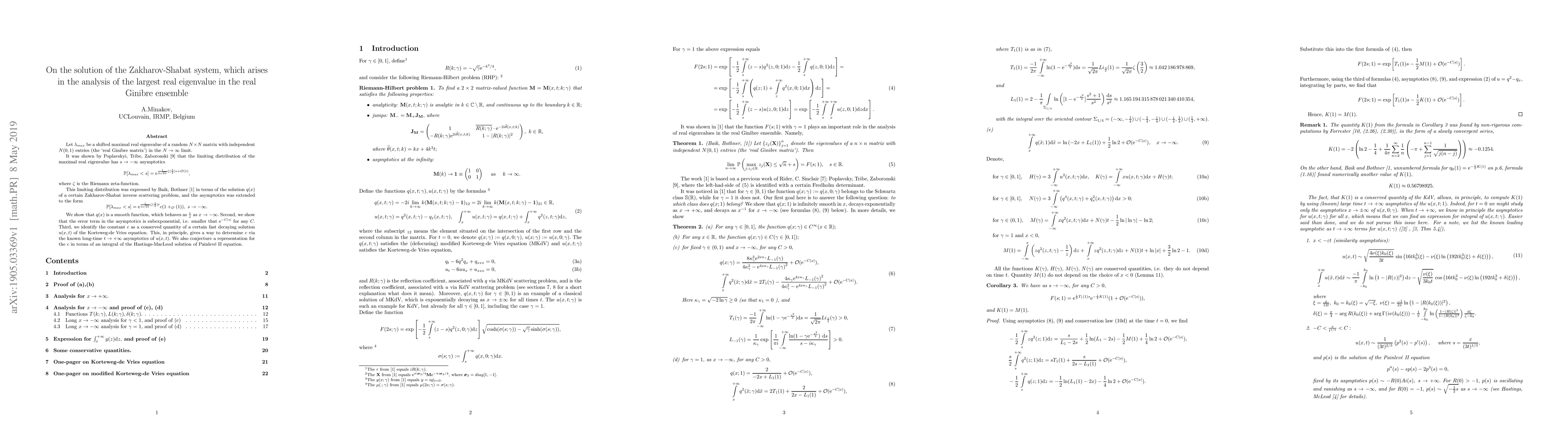 This paper investigates the asymptotic behavior of the largest real eigenvalue in the real Ginibre ensemble, showing that the solution $q(x)$ of the Zakharov-Shabat system is smooth and behaves as $\frac{1}{x}$ as $x\to-\infty$. It also proves the subexponential error term in the asymptotics and identifies the constant $c$ as a conserved quantity linked to the long-time behavior of a KdV equation solution.