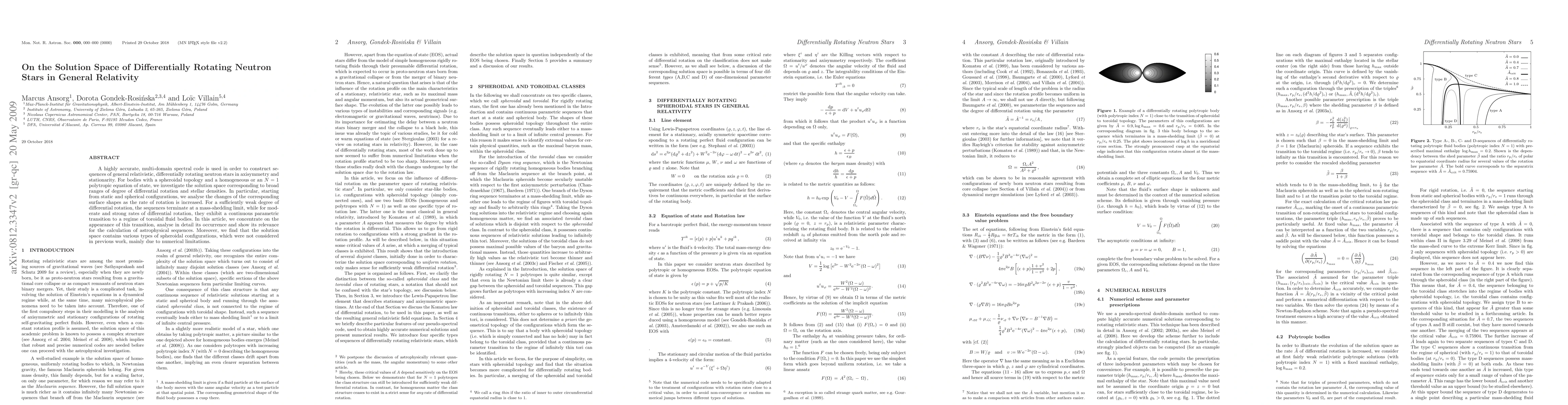 A highly accurate, multi-domain spectral code is used in order to construct sequences of general relativistic, differentially rotating neutron stars in axisymmetry and stationarity. For bodies with a spheroidal topology and a homogeneous or an N=1 polytropic equation of state, we investigate the solution space corresponding to broad ranges of degree of differential rotation and stellar densities. In particular, starting from static and spherical configurations, we analyse the changes of the corresponding surface shapes as the rate of rotation is increased. For a sufficiently weak degree of differential rotation, the sequences terminate at a mass-shedding limit, while for moderate and strong rates of differential rotation, they exhibit a continuous parametric transition to a regime of toroidal fluid bodies. In this article, we concentrate on the appearance of this transition, analyse in detail its occurrence and show its relevance for the calculation of astrophysical sequences. Moreover, we find that the solution space contains various types of spheroidal configurations, which were not considered in previous work, mainly due to numerical limitations.