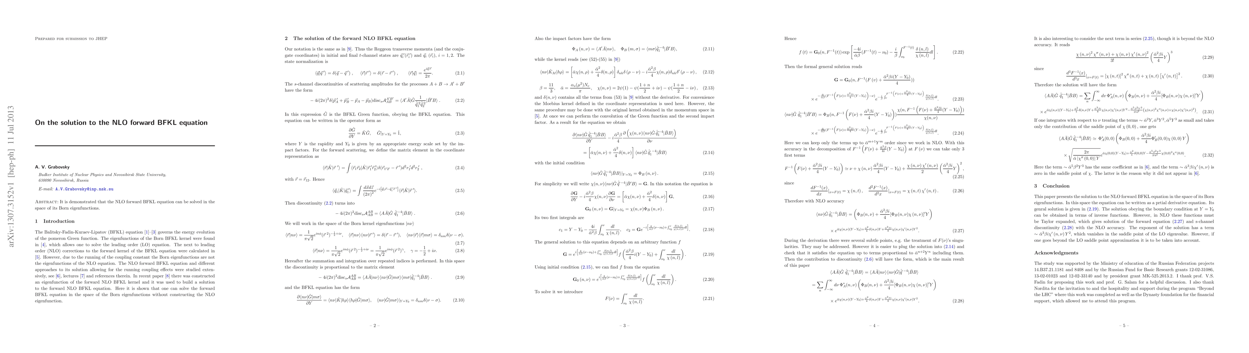 Summary: The paper presents a solution to the next-to-leading order (NLO) forward BFKL equation using the Born eigenfunctions, providing a method to address this complex problem in quantum field theory.