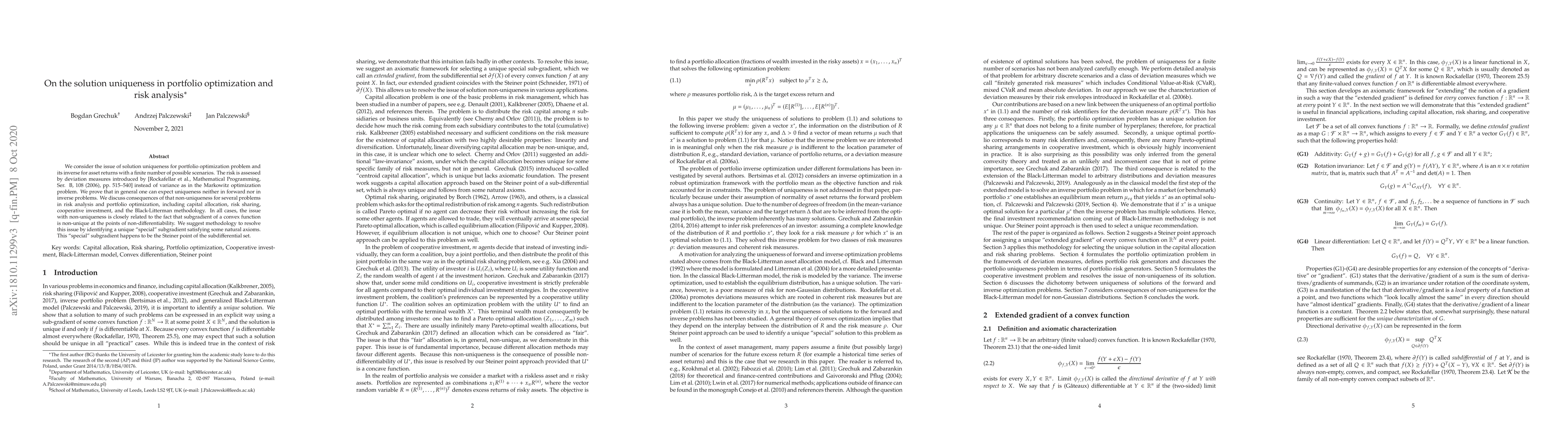 We consider the issue of solution uniqueness for portfolio optimization problem and its inverse for asset returns with a finite number of possible scenarios. The risk is assessed by deviation measures introduced by [Rockafellar et al., Mathematical Programming, Ser. B, 108 (2006), pp. 515-540] instead of variance as in the Markowitz optimization problem. We prove that in general one can expect uniqueness neither in forward nor in inverse problems. We discuss consequences of that non-uniqueness for several problems in risk analysis and portfolio optimization, including capital allocation, risk sharing, cooperative investment, and the Black-Litterman methodology. In all cases, the issue with non-uniqueness is closely related to the fact that subgradient of a convex function is non-unique at the points of non-differentiability. We suggest methodology to resolve this issue by identifying a unique "special" subgradient satisfying some natural axioms. This "special" subgradient happens to be the Stainer point of the subdifferential set.