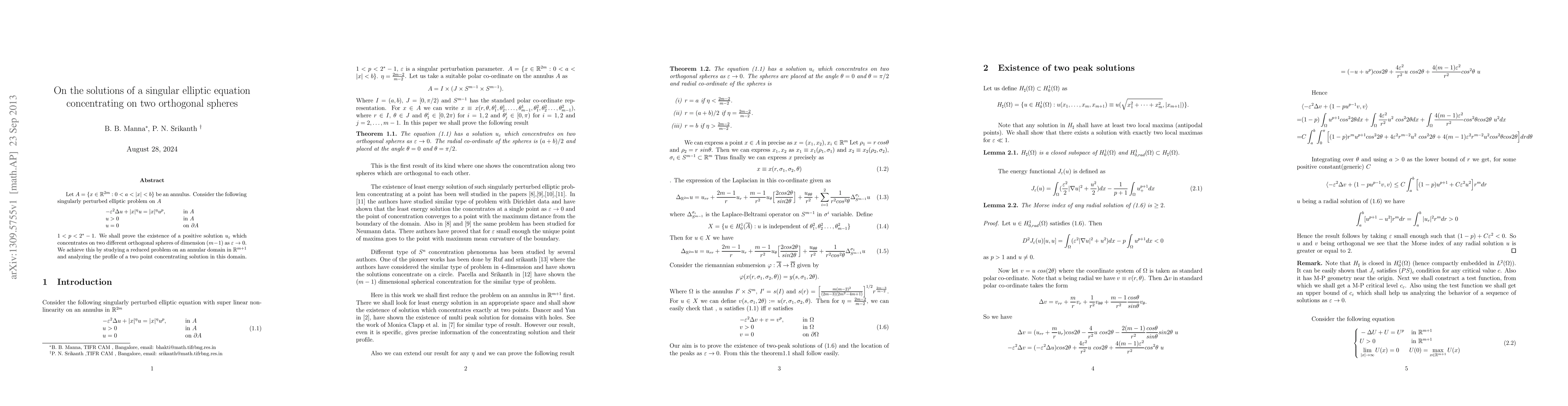 This paper investigates the existence of positive solutions to a singularly perturbed elliptic equation in an annular domain, demonstrating that as the perturbation parameter approaches zero, the solution concentrates on two orthogonal spheres of lower dimension. The analysis involves studying a reduced problem and examining the profile of a two-point concentrating solution.