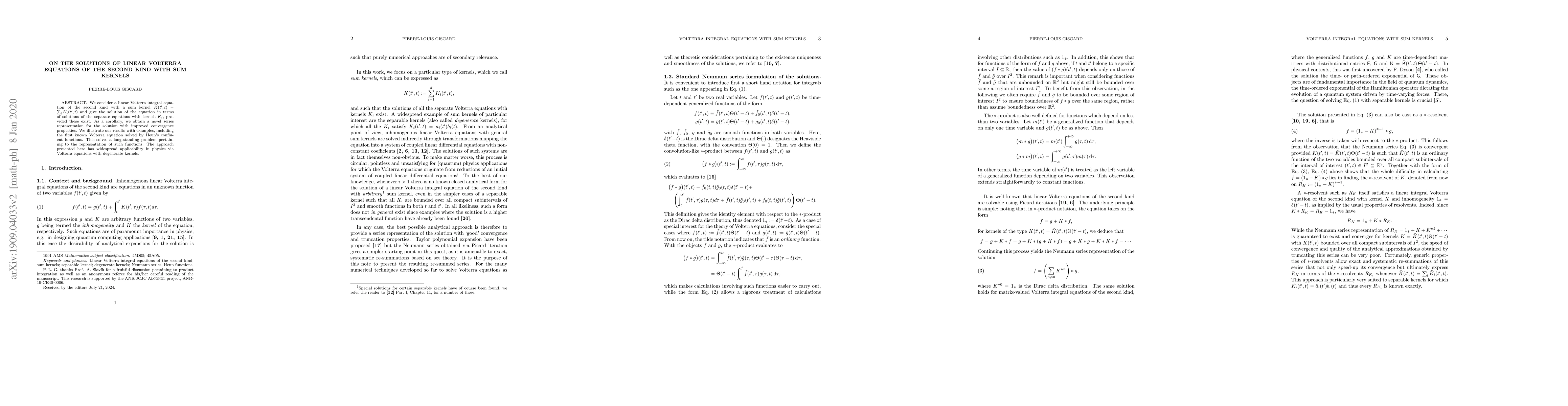 This paper provides a solution for linear Volterra integral equations of the second kind with sum kernels, expressing the solution in terms of solutions of separate equations with individual kernels. It introduces a novel series representation with enhanced convergence, illustrated by solving a historically significant equation using Heun's confluent functions.