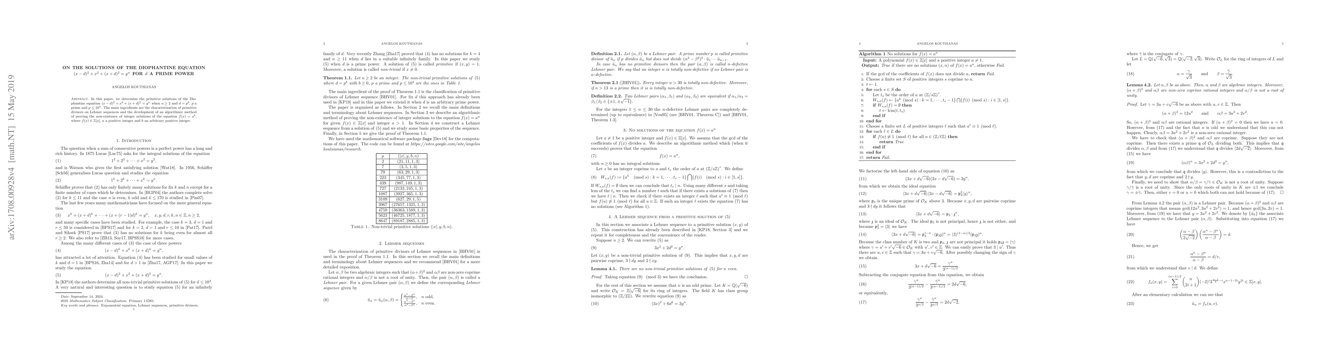 In this paper, we determine the primitive solutions of the Diophantine equation $(x-d)^2+x^2+(x+d)^2=y^n$ when $n\geq 2$ and $d=p^b$, $p$ a prime and $p\leq 10^4$. The main ingredients are the characterization of primitive divisors on Lehmer sequences and the development of an algorithmic method of proving the non-existence of integer solutions of the equation $f(x)=a^b$, where $f(x)\in\mathbb Z[x]$, $a$ a positive integer and $b$ an arbitrary positive integer.