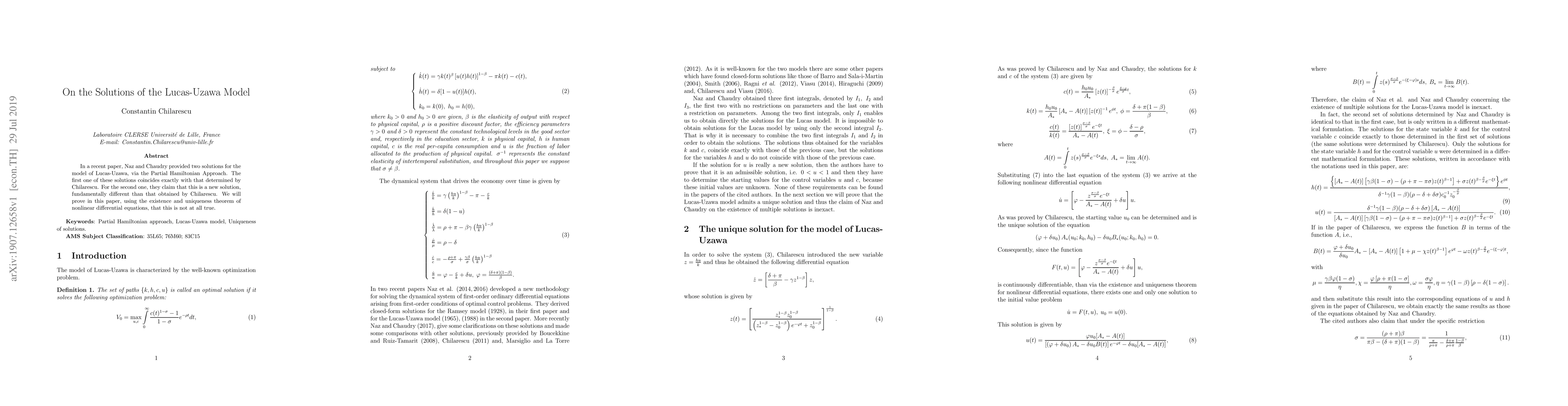 In a recent paper, Naz and Chaudry provided two solutions for the model of Lucas-Uzawa, via the Partial Hamiltonian Approach. The first one of these solutions coincides exactly with that determined by Chilarescu. For the second one, they claim that this is a new solution, fundamentally different than that obtained by Chilarescu. We will prove in this paper, using the existence and uniqueness theorem of nonlinear differential equations, that this is not at all true.