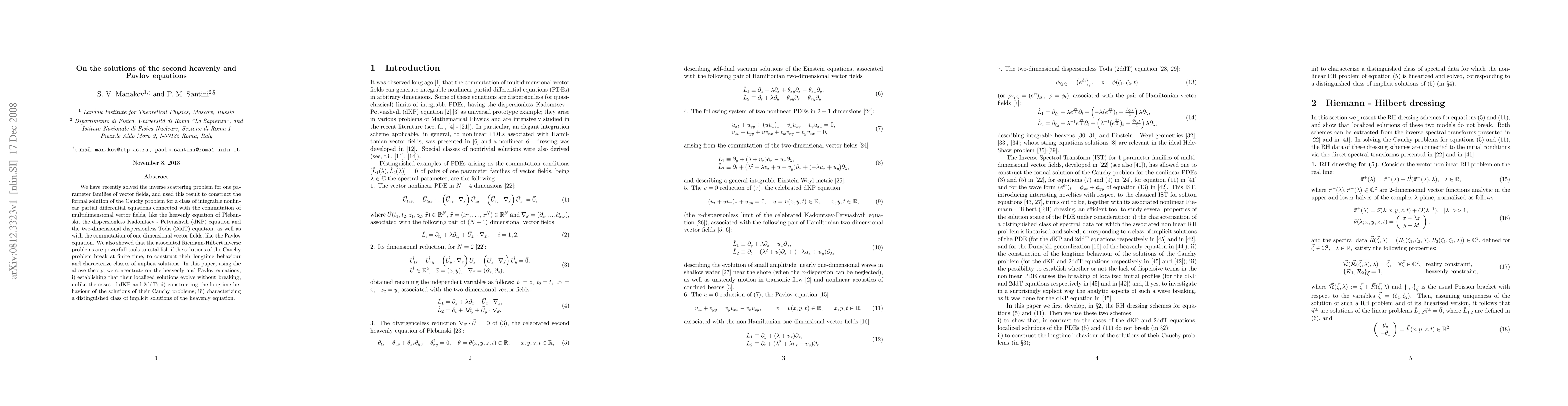 We have recently solved the inverse scattering problem for one parameter families of vector fields, and used this result to construct the formal solution of the Cauchy problem for a class of integrable nonlinear partial differential equations connected with the commutation of multidimensional vector fields, like the heavenly equation of Plebanski, the dispersionless Kadomtsev - Petviashvili (dKP) equation and the two-dimensional dispersionless Toda (2ddT) equation, as well as with the commutation of one dimensional vector fields, like the Pavlov equation. We also showed that the associated Riemann-Hilbert inverse problems are powerfull tools to establish if the solutions of the Cauchy problem break at finite time,to construct their longtime behaviour and characterize classes of implicit solutions. In this paper, using the above theory, we concentrate on the heavenly and Pavlov equations, i) establishing that their localized solutions evolve without breaking, unlike the cases of dKP and 2ddT; ii) constructing the longtime behaviour of the solutions of their Cauchy problems; iii) characterizing a distinguished class of implicit solutions of the heavenly equation.