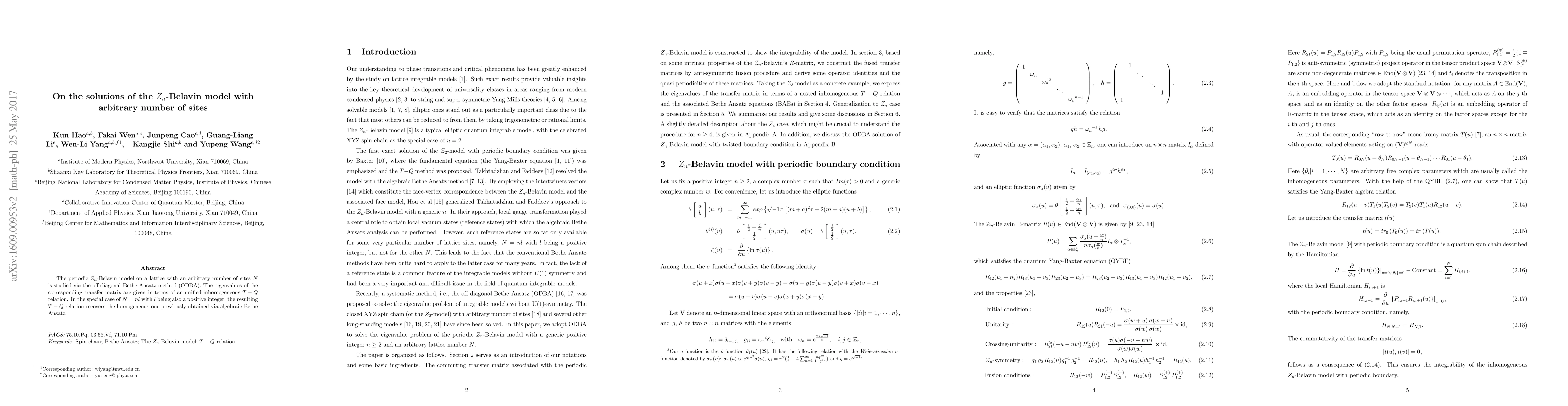 The $Z_n$-Belavin model on a lattice with an arbitrary number of sites was solved using the off-diagonal Bethe Ansatz method, yielding a unified inhomogeneous $T-Q$ relation that recovers the homogeneous one for specific cases.