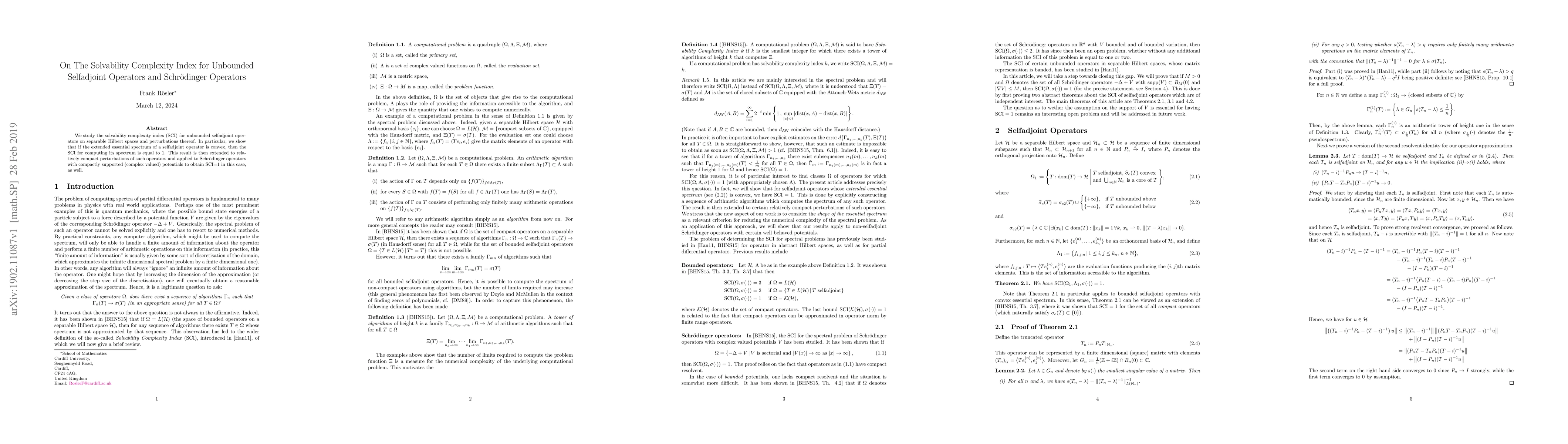 We study the solvability complexity index (SCI) for unbounded selfadjoint operators on separable Hilbert spaces and perturbations thereof. In particular, we show that if the extended essential spectrum of a selfadjoint operator is convex, then the SCI for computing its spectrum is equal to 1. This result is then extended to relatively compact perturbations of such operators and applied to Schr\"{o}dinger operators with compactly supported (complex valued) potentials to obtain SCI=1 in this case, as well.