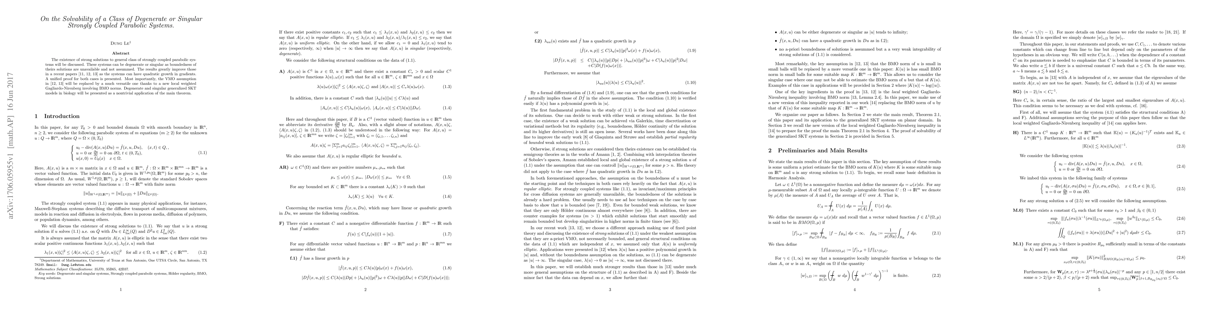 The existence of strong solutions to general class of strongly coupled parabolic systems will be discussed. These systems can be degenerate or singular as boundedness of theirs solutions are unavailable and not assummed. The results greatly improve those in a recent papers \cite{letrans,dleJFA,dleANS} as the systems can have quadratic growth in gradients. A unified proof for both cases is presented. Most importantly, the VMO assumption in \cite{dleJFA,dleANS} will be replaced by a much versatile one thanks to a new local weighted Gagliardo-Nirenberg involving BMO norms. Degenerate and singular generalized SKT models in biology will be presented as a nontrivial application of the main theorem.