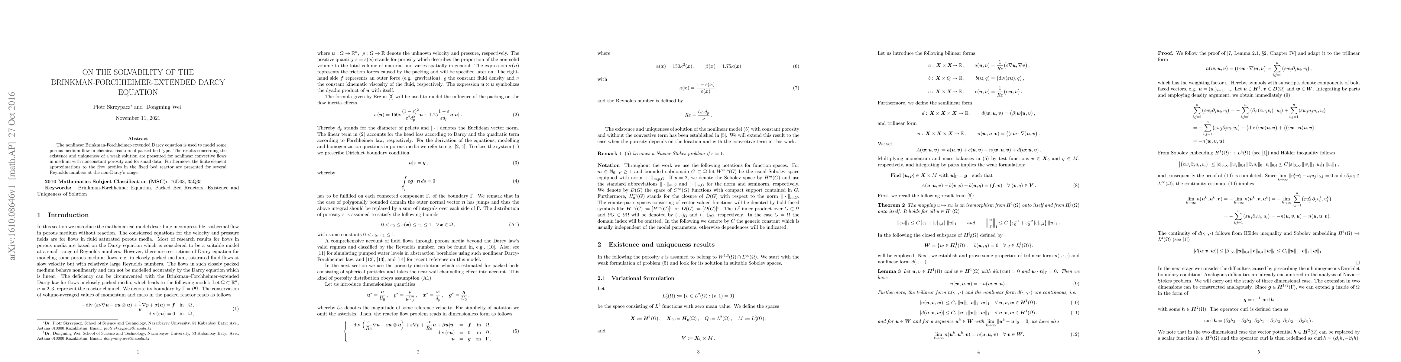 The nonlinear Brinkman-Forchheimer-extended Darcy equation is used to model some porous medium flow in chemical reactors of packed bed type. The results concerning the existence and uniqueness of a weak solution are presented for nonlinear convective flows in medium with nonconstant porosity and for small data. Furthermore, the finite element approximations to the flow profiles in the fixed bed reactor are presented for several Reynolds numbers at the non-Darcy's range.