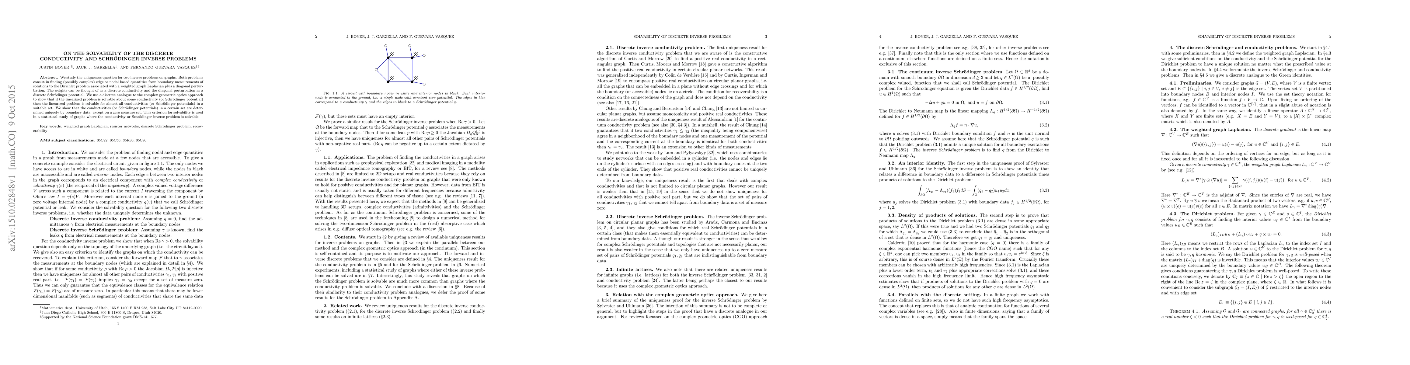 We study the uniqueness question for two inverse problems on graphs. Both problems consist in finding (possibly complex) edge or nodal based quantities from boundary measurements of solutions to the Dirichlet problem associated with a weighted graph Laplacian plus a diagonal perturbation. The weights can be thought of as a discrete conductivity and the diagonal perturbation as a discrete Schr\"odinger potential. We use a discrete analogue to the complex geometric optics approach to show that if the linearized problem is solvable about some conductivity (or Schr\"odinger potential) then the linearized problem is solvable for almost all conductivities (or Schr\"odinger potentials) in a suitable set. We show that the conductivities (or Schr\"odinger potentials) in a certain set are determined uniquely by boundary data, except on a zero measure set. This criterion for solvability is used in a statistical study of graphs where the conductivity or Schr\"odinger inverse problem is solvable.
