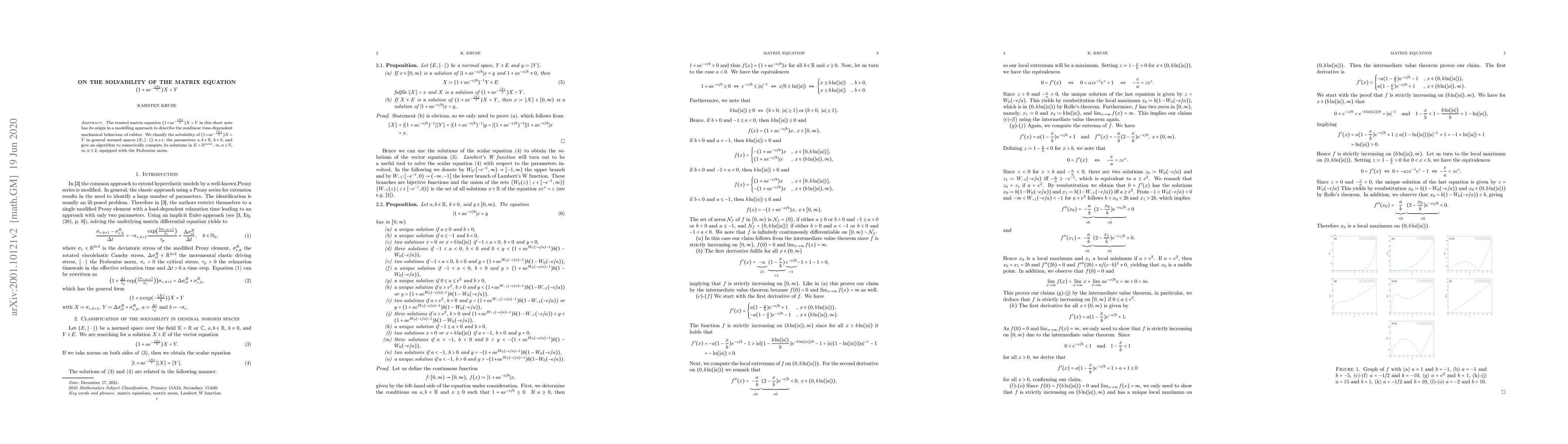 The treated matrix equation $(1+ae^{-\frac{\|X\|}{b}})X=Y$ in this short note has its origin in a modelling approach to describe the nonlinear time-dependent mechanical behaviour of rubber. We classify the solvability of $(1+ae^{-\frac{\|X\|}{b}})X=Y$ in general normed spaces $(E,\|\cdot\|)$ w.r.t. the parameters $a,b\in\mathbb{R}$, $b\neq 0$, and give an algorithm to numerically compute its solutions in $E=\mathbb{R}^{m\times n}$, $m,n\in\mathbb{N}$, $m,n\geq 2$, equipped with the Frobenius norm.