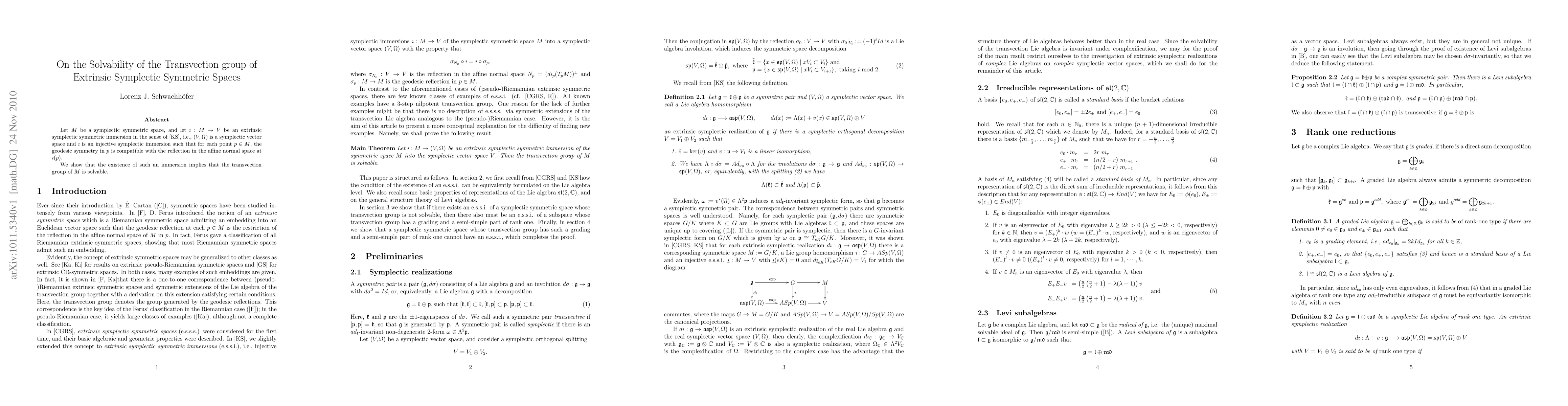 This paper demonstrates that the existence of an extrinsic symplectic symmetric immersion of a symplectic symmetric space $M$ into a symplectic vector space $V$ implies that the transvection group of $M$ is solvable. The immersion preserves geodesic symmetries and reflections in affine normal spaces.