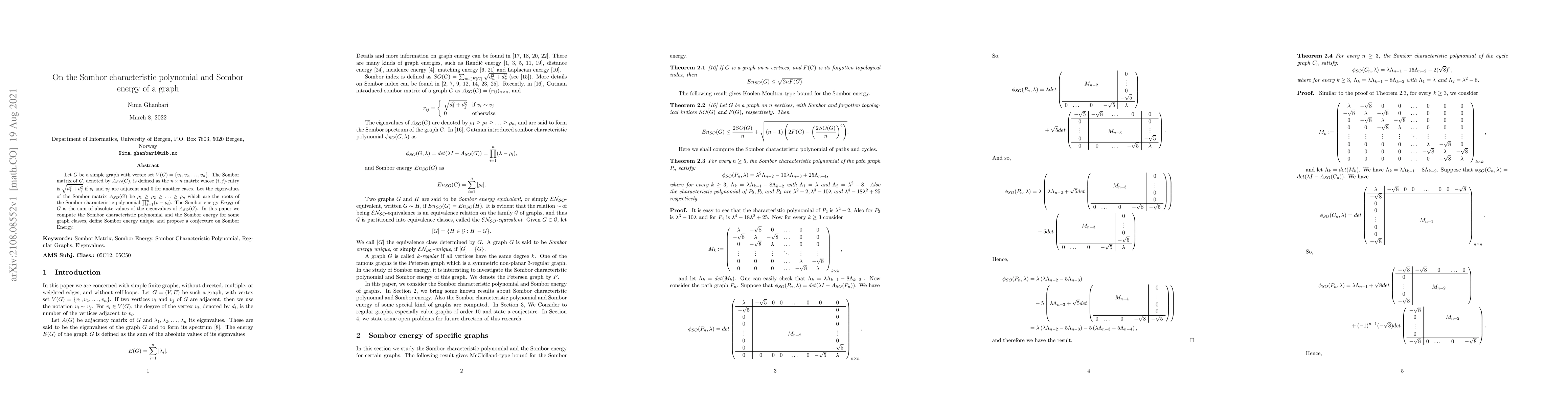 Let $G$ be a simple graph with vertex set $V(G) = \{v_1, v_2,\ldots, v_n\}$. The Sombor matrix of $G$, denoted by $A_{SO}(G)$, is defined as the $n\times n$ matrix whose $(i,j)$-entry is $\sqrt{d_i^2+d_j^2}$ if $v_i$ and $v_j$ are adjacent and $0$ for another cases. Let the eigenvalues of the Sombor matrix $A_{SO}(G)$ be $\rho_1\geq \rho_2\geq \ldots\geq \rho_n$ which are the roots of the Sombor characteristic polynomial $\prod_{i=1}^n (\rho-\rho_i)$. The Sombor energy $En_{SO}$ of $G$ is the sum of absolute values of the eigenvalues of $A_{SO}(G)$. In this paper we compute the Sombor characteristic polynomial and the Sombor energy for some graph classes, define Sombor energy unique and propose a conjecture on Sombor Energy.