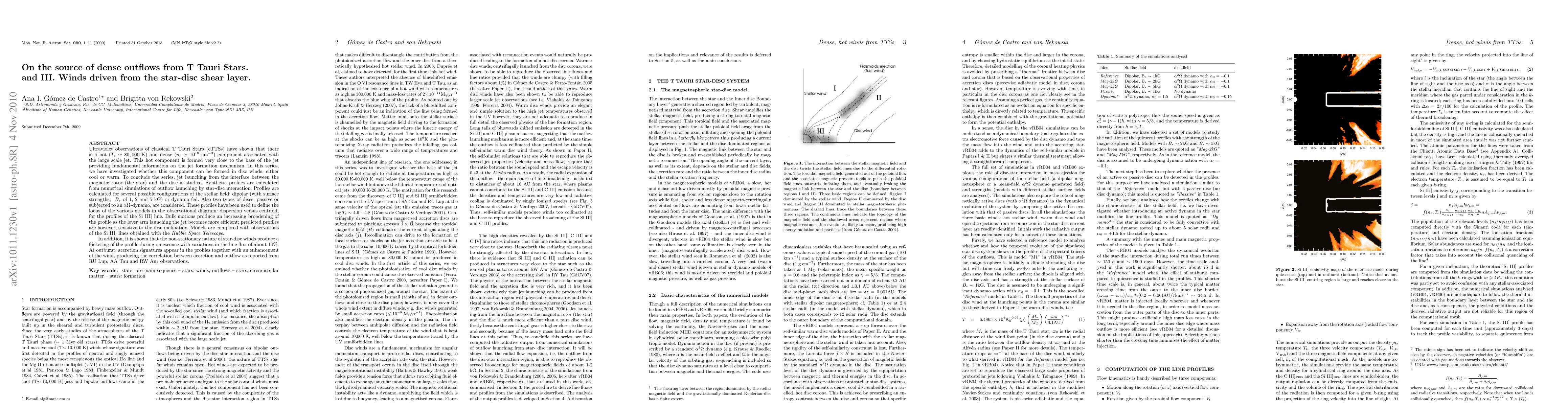 Ultraviolet observations of classical T Tauri Stars (cTTSs) have shown that there is a hot (Te ~ 80,000 K) and dense (ne ~ 1e10 cm-3) component associated with the large scale jet. This hot component is formed very close to the base of the jet providing fundamental information on the jet formation mechanism. In this series, we have investigated whether this component can be formed in disc winds, either cool or warm. To conclude the series, jet launching from the interface between the magnetic rotor (the star) and the disc is studied. Synthetic profiles are calculated from numerical simulations of outflow launching by star-disc interaction. Profiles are calculated for several possible configurations of the stellar field: dipolar (with surface strengths, B of 1, 2 and 5 kG) or dynamo fed. Also two types of discs, passive or subjected to an alpha/Omega-dynamo, are considered. These profiles have been used to define the locus of the various models in the observational diagram: dispersion versus centroid, for the profiles of the SiIII] line. Bulk motions produce an increasing broadening of the profile as the lever arm launching the jet becomes more efficient; predicted profiles are however, sensitive to the disc inclination. Models are compared with observations of the SiIII] lines obtained with the Hubble Space Telescope. In addition, it is shown that the non-stationary nature of star-disc winds produce a flickering of the profile during quiescence with variations in the line flux of about 10%. At outburst, accretion signatures appear in the profiles together with an enhancement of the wind, producing the correlation between accretion and outflow as reported from RU Lup, AA Tau and RW Aur observations.