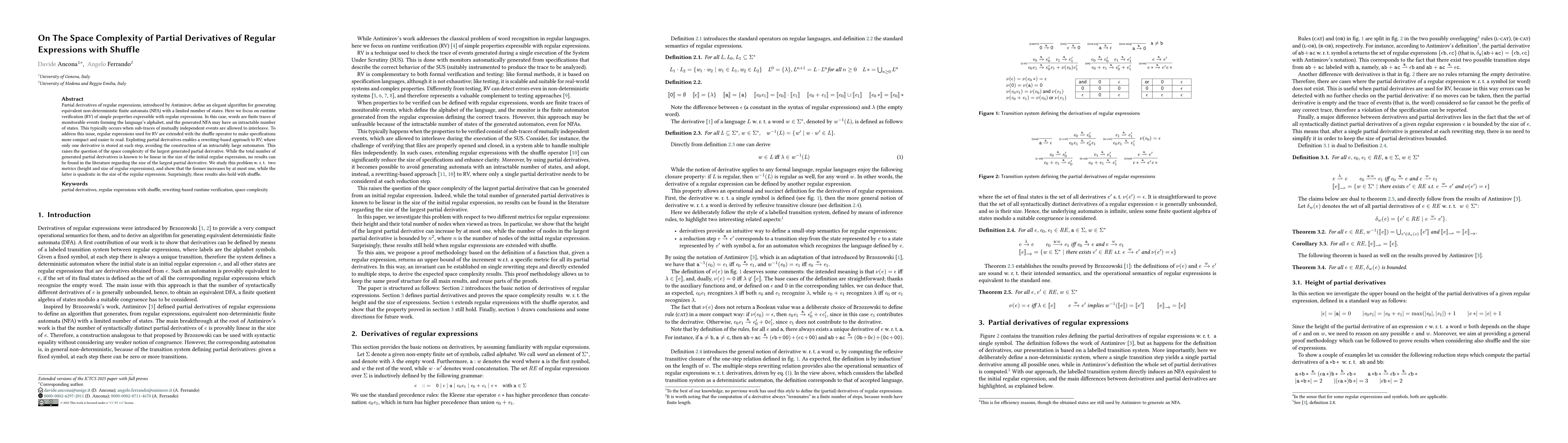 Partial derivatives of regular expressions, introduced by Antimirov, define an elegant algorithm for generating equivalent non-deterministic finite automata (NFA) with a limited number of states. Here we focus on runtime verification (RV) of simple properties expressible with regular expressions. In this case, words are finite traces of monitorable events forming the language's alphabet, and the generated NFA may have an intractable number of states. This typically occurs when sub-traces of mutually independent events are allowed to interleave. To address this issue, regular expressions used for RV are extended with the shuffle operator to make specifications more compact and easier to read. Exploiting partial derivatives enables a rewriting-based approach to RV, where only one derivative is stored at each step, avoiding the construction of an intractably large automaton. This raises the question of the space complexity of the largest generated partial derivative. While the total number of generated partial derivatives is known to be linear in the size of the initial regular expression, no results can be found in the literature regarding the size of the largest partial derivative. We study this problem w.r.t. two metrics (height and size of regular expressions), and show that the former increases by at most one, while the latter is quadratic in the size of the regular expression. Surprisingly, these results also hold with shuffle.