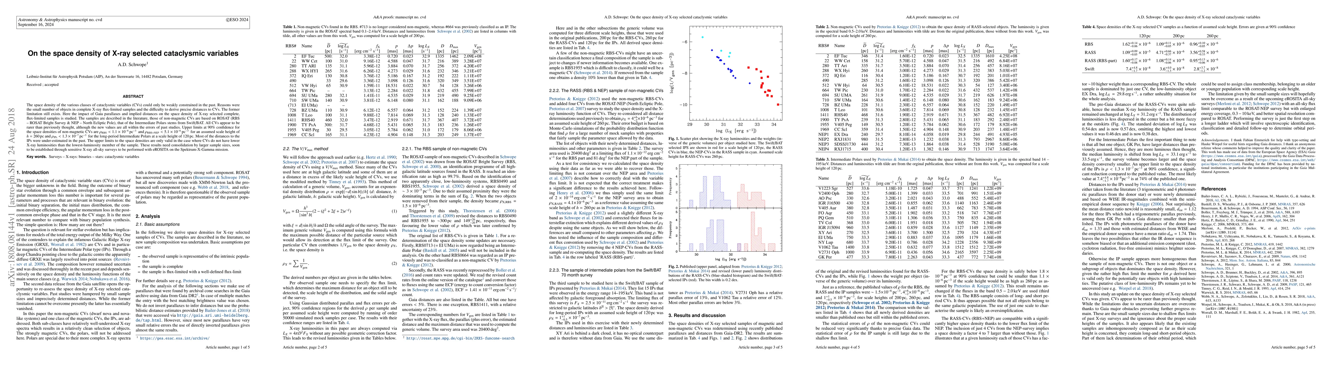 The space density of the various classes of cataclysmic variables (CVs) could only be weakly constrained in the past. Reasons were the small number of objects in complete X-ray flux-limited samples and the difficulty to derive precise distances to CVs. The former limitation still exists. Here the impact of Gaia parallaxes and implied distances on the space density of X-ray selected complete, flux-limited samples is studied. The samples are described in the literature, those of non-magnetic CVs are based on ROSAT (RBS - ROSAT Bright Survey & NEP -- North Ecliptic Pole), that of the Intermediate Polars stems from Swift/BAT. All CVs appear to be rarer than previously thought, although the new values are all within the errors of past studies. Upper limits at 90\% confidence for the space densities of non-magnetic CVs are $\rho_{\rm RBS} < 1.1 \times 10^{-6}$ pc$^{-3}$, and $\rho_{\rm RBS+NEP} < 5.1 \times 10^{-6}$ p$^{-3}$, for an assumed scale height of $h=260$ pc and $\rho_{\rm IPs} < 1.3 \times 10^{-7}$ p$^{-3}$ for the long-period Intermediate Polars at a scale height of 120 pc. Most of the distances to the IPs were under-estimated in the past. The upper limits to the space densities are only valid in the case where CVs do not have lower X-ray luminosities than the lowest-luminosity member of the sample. These results need consolidation by larger sample sizes, soon to be established through sensitive X-ray all-sky surveys to be performed with eROSITA on the Spektrum-X-Gamma mission.