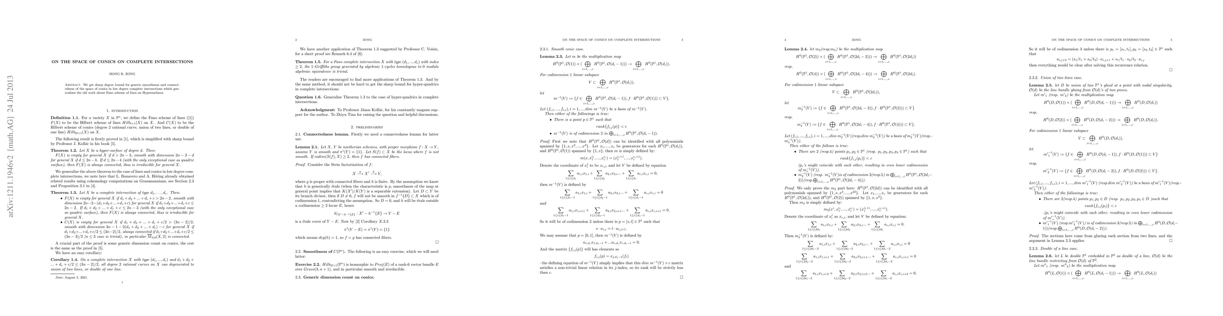 Summary: This paper establishes a precise degree bound for the generic smoothness and connectedness of the conic space within low-degree complete intersections, extending previous results on the Fano scheme of lines on hypersurfaces.