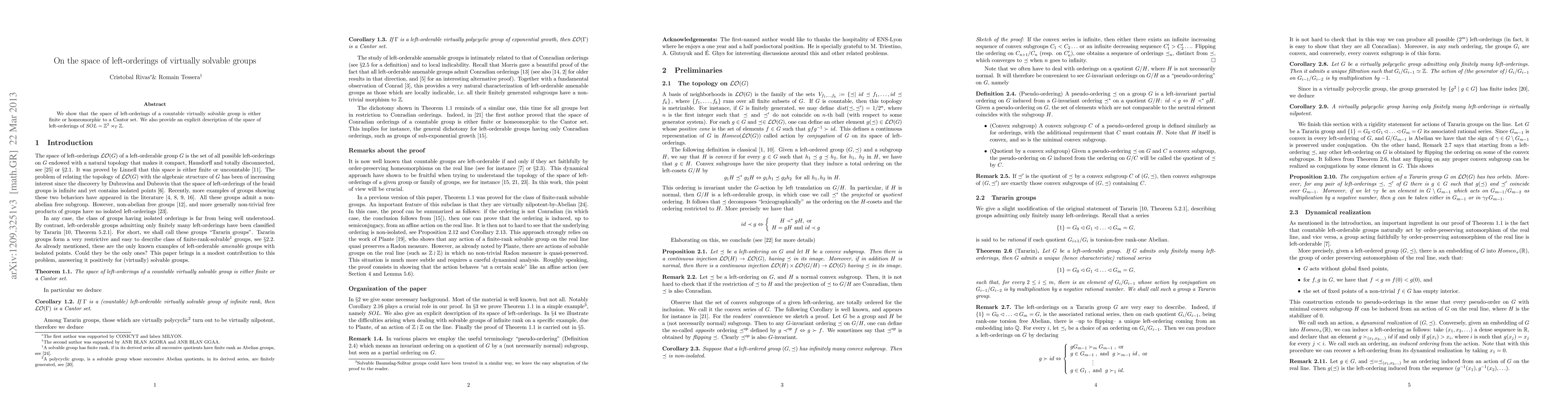 The paper demonstrates that the space of left-orderings for countable virtually solvable groups is either finite or topologically homeomorphic to a Cantor set. It further explicitly characterizes the left-orderings of the $SOL$ group, $\mathbb{Z}^2 \rtimes_T \mathbb{Z}$.