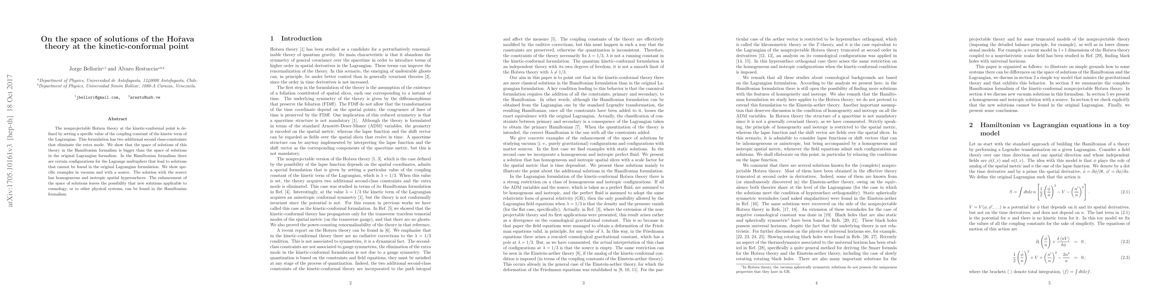 The nonprojectable Horava theory at the kinetic-conformal point is defined by setting a specific value of the coupling constant of the kinetic term of the Lagrangian. This formulation has two additional second class-constraints that eliminate the extra mode. We show that the space of solutions of this theory in the Hamiltonian formalism is bigger than the space of solutions in the original Lagrangian formalism. In the Hamiltonian formalism there are certain configurations for the Lagrange multupliers that lead to solutions that cannot be found in the original Lagrangian formulation. We show specific examples in vacuum and with a source. The solution with the source has homogeneous and isotropic spatial hypersurfaces. The enhancement of the space of solutions leaves the possibility that new solutions applicable to cosmology, or to other physical systems, can be found in the Hamiltonian formalism.