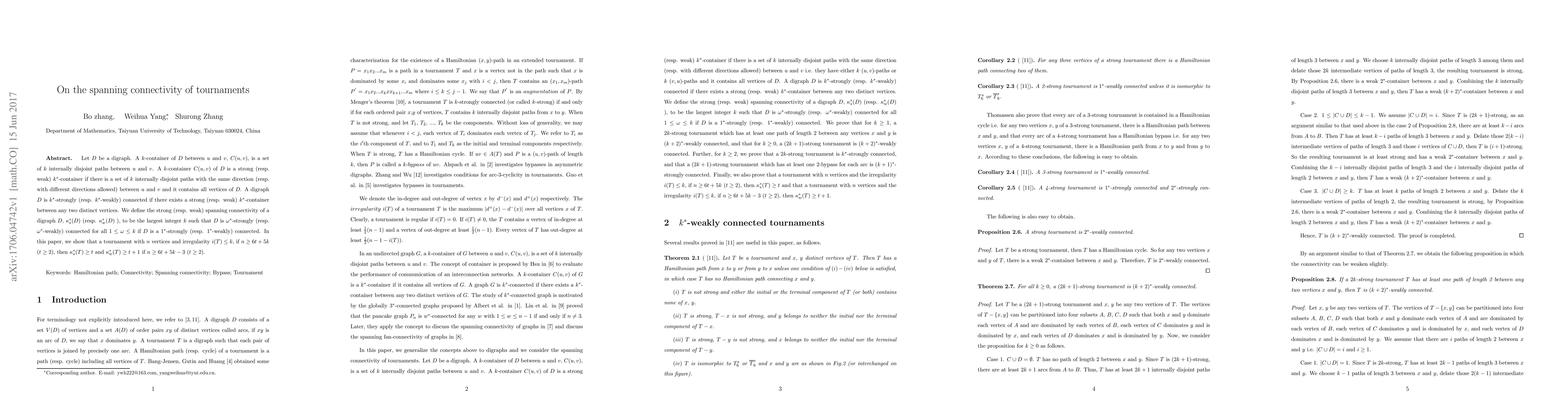 Let $D$ be a digraph. A $k$-container of $D$ between $u$ and $v$, $C(u,v)$, is a set of $k$ internally disjoint paths between $u$ and $v$. A $k$-container $C(u,v)$ of $D$ is a strong (resp. weak) $k^{*}$-container if there is a set of $k$ internally disjoint paths with the same direction (resp. with different directions allowed) between $u$ and $v$ and it contains all vertices of $D$. A digraph $D$ is $k^{*}$-strongly (resp. $k^{*}$-weakly) connected if there exists a strong (resp. weak) $k^{*}$-container between any two distinct vertices. We define the strong (resp. weak) spanning connectivity of a digraph $D$, $\kappa_{s}^{*}(D)$ (resp. $\kappa_{w}^{*}(D)$ ), to be the largest integer $k$ such that $D$ is $\omega^{*}$-strongly (resp. $\omega^{*}$-weakly) connected for all $1\leq \omega\leq k$ if $D$ is a $1^{*}$-strongly (resp. $1^{*}$-weakly) connected. In this paper, we show that a tournament with $n$ vertices and irregularity $i(T)\leq k$, if $n\geq6t+5k$ $(t\geq2)$, then $\kappa_{s}^{*}(T)\geq t$ and $\kappa_{w}^{*}(T)\geq t+1$ if $n\geq6t+5k-3$ $(t\geq2)$.