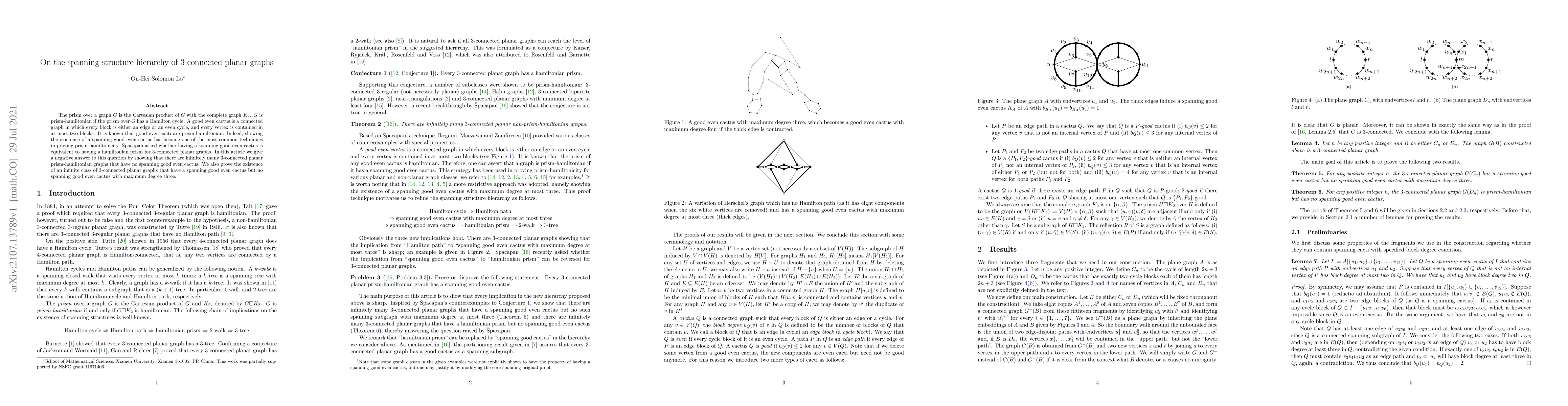 The prism over a graph $G$ is the Cartesian product of $G$ with the complete graph $K_2$. $G$ is prism-hamiltonian if the prism over $G$ has a Hamilton cycle. A good even cactus is a connected graph in which every block is either an edge or an even cycle, and every vertex is contained in at most two blocks. It is known that good even cacti are prism-hamiltonian. Indeed, showing the existence of a spanning good even cactus has become one of the most common techniques in proving prism-hamiltonicity. \v{S}pacapan asked whether having a spanning good even cactus is equivalent to having a hamiltonian prism for 3-connected planar graphs. In this article we give a negative answer to this question by showing that there are infinitely many 3-connected planar prism-hamiltonian graphs that have no spanning good even cactus. We also prove the existence of an infinite class of 3-connected planar graphs that have a spanning good even cactus but no spanning good even cactus with maximum degree three.