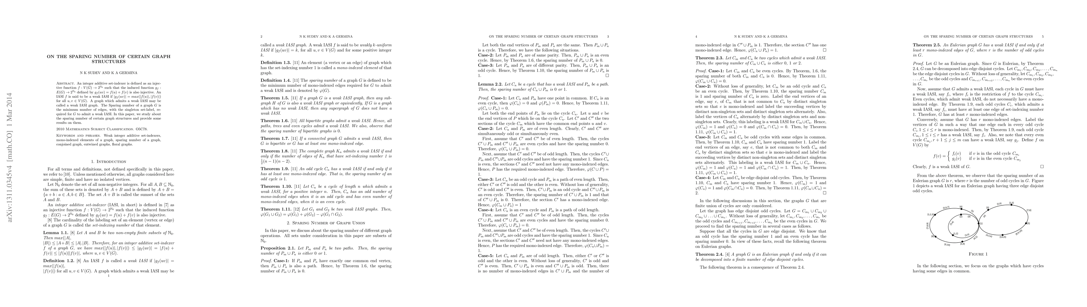 The paper presents new definitions (conjoined, entwined, floral graphs) and provides detailed analysis of the sparing number for these graph structures under weak IASI.