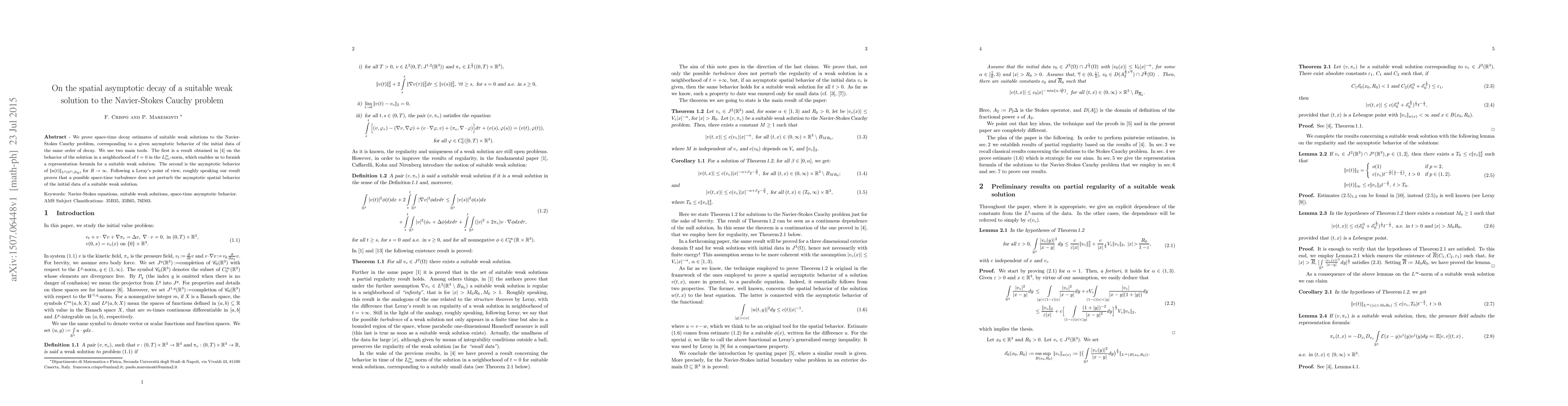 We prove space-time decay estimates of suitable weak solutions to the Navier-Stokes Cauchy problem, corresponding to a given asymptotic behavior of the initial data of the same order of decay. We use two main tools. The first is a result obtained by the authors in the paper "A remark on the partial regularity of a suitable weak solution to the Navier-Stokes Cauchy problem" (submitted), on the behavior of the solution in a neighborhood of $t=0$ in the $L^\infty_{loc}$-norm, which enables us to furnish a representation formula for a suitable weak solution. The second is the asymptotic behavior of the $L^2(\R^3\setminus B_R)$ norm of $u(t)$ for $R\to\infty$. Following a Leray's point of view, roughly speaking our result proves that a possible space-time turbulence does not perturb the asymptotic spatial behavior of the initial data of a suitable weak solution.