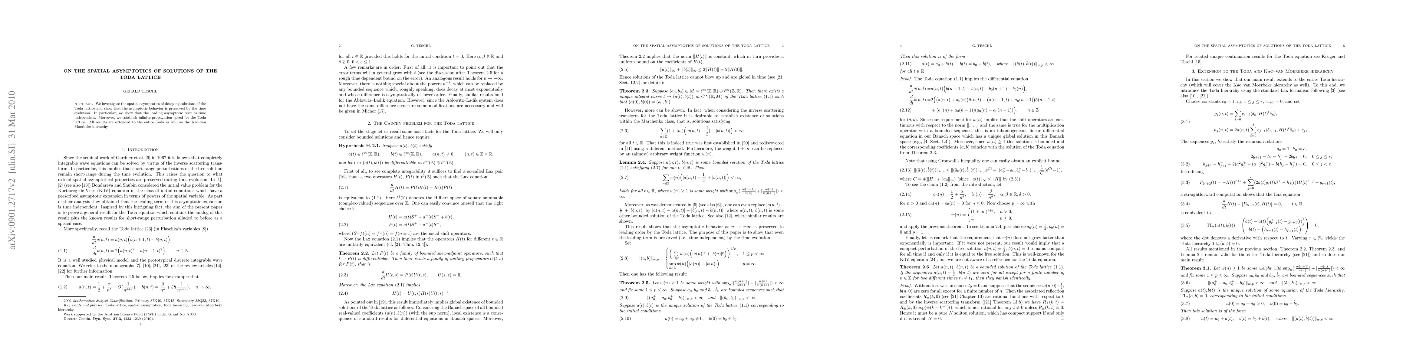 Research on the Toda lattice reveals that decaying solutions maintain their spatial asymptotics over time and even travel at infinite speed, with the leading term being independent of time.