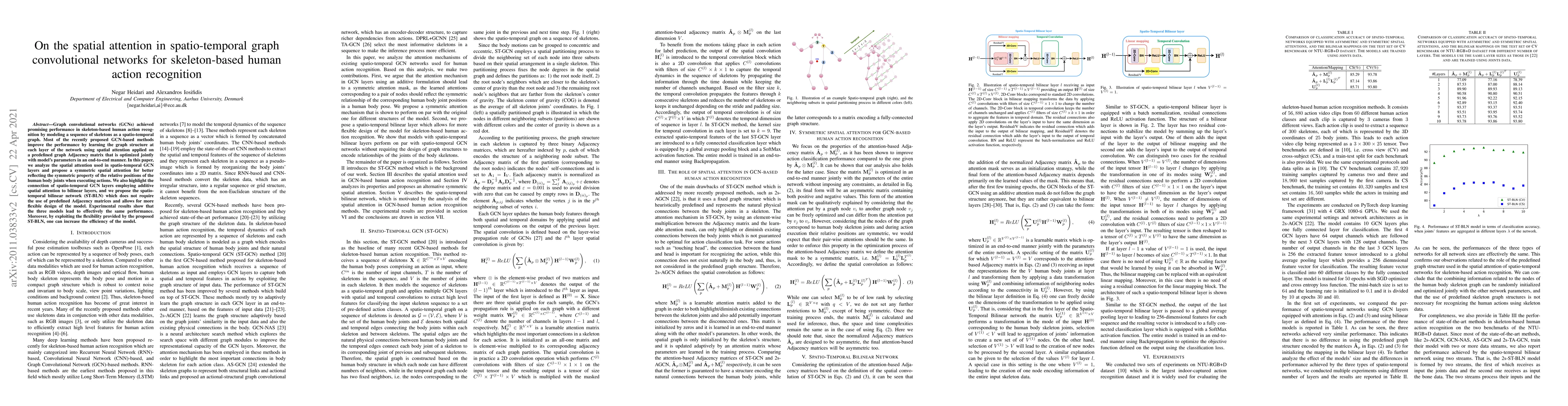 Graph convolutional networks (GCNs) achieved promising performance in skeleton-based human action recognition by modeling a sequence of skeletons as a spatio-temporal graph. Most of the recently proposed GCN-based methods improve the performance by learning the graph structure at each layer of the network using a spatial attention applied on a predefined graph Adjacency matrix that is optimized jointly with model's parameters in an end-to-end manner. In this paper, we analyze the spatial attention used in spatio-temporal GCN layers and propose a symmetric spatial attention for better reflecting the symmetric property of the relative positions of the human body joints when executing actions. We also highlight the connection of spatio-temporal GCN layers employing additive spatial attention to bilinear layers, and we propose the spatio-temporal bilinear network (ST-BLN) which does not require the use of predefined Adjacency matrices and allows for more flexible design of the model. Experimental results show that the three models lead to effectively the same performance. Moreover, by exploiting the flexibility provided by the proposed ST-BLN, one can increase the efficiency of the model.