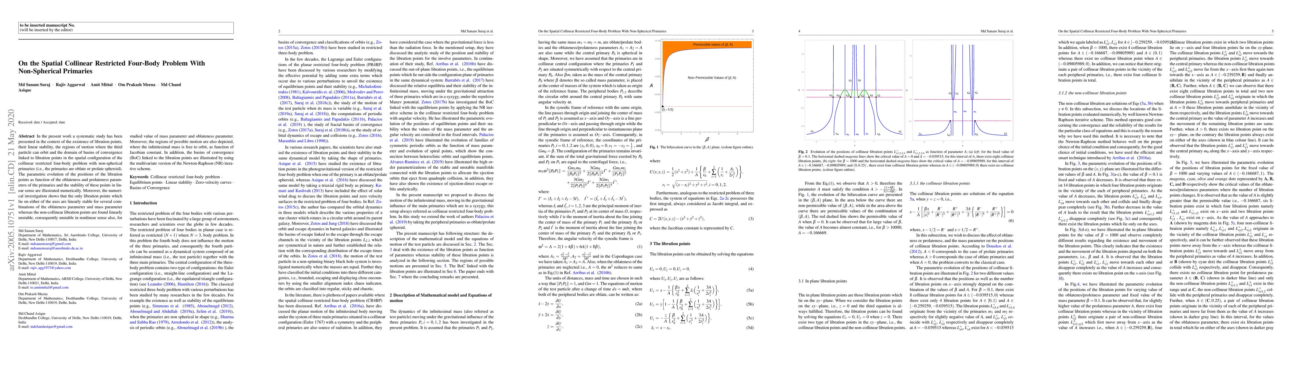 In the present work a systematic study has been presented in the context of the existence of libration points, their linear stability, the regions of motion where the third particle can orbit and the domain of basins of convergence linked to libration points in the spatial configuration of the collinear restricted four-body problem with non-spherical primaries (i.e., the primaries are oblate or prolate spheroid). The parametric evolution of the positions of the libration points as function of the oblateness and prolateness parameters of the primaries and the stability of these points in linear sense are illustrated numerically. Moreover, the numerical investigation shows that the only libration points which lie on either of the axes are linearly stable for several combinations of the oblateness parameter and mass parameter whereas the non-collinear libration points are found linearly unstable, consequently unstable in nonlinear sense also, for studied value of mass parameter and oblateness parameter. Moreover, the regions of possible motion are also depicted, where the infinitesimal mass is free to orbit, as function of Jacobian constant. In addition, the basins of convergence (BoC) linked to the libration points are illustrated by using the multivariate version of the Newton-Raphson (NR) iterative scheme.