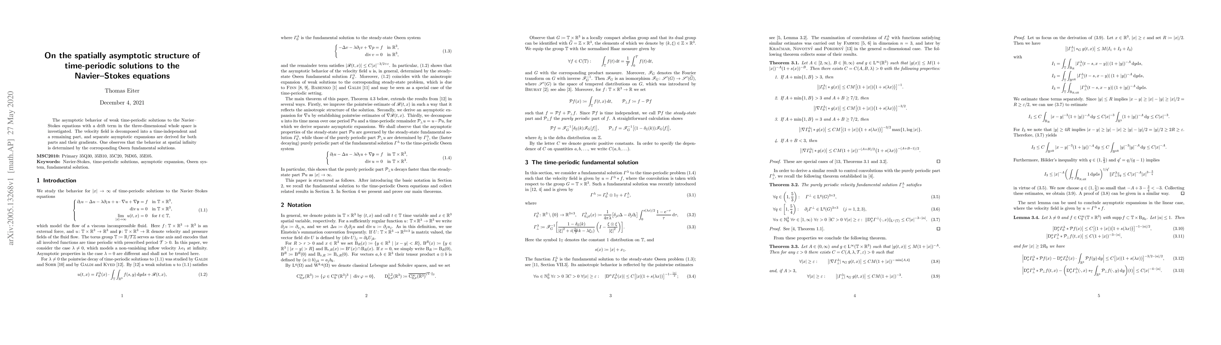 This paper investigates the asymptotic behavior of time-periodic solutions to the Navier-Stokes equations in three-dimensional space, decomposing the velocity field into time-independent and remaining parts, and deriving separate asymptotic expansions for both. The findings show that the spatial infinity behavior is governed by Oseen fundamental solutions.