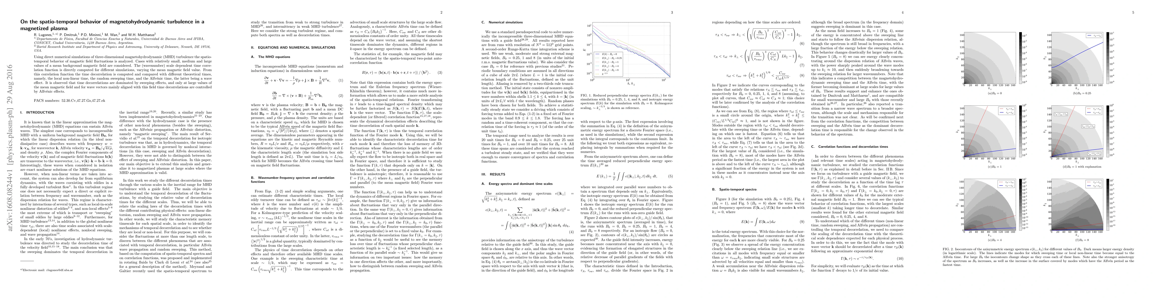 This paper uses direct numerical simulations to analyze the spatio-temporal behavior of magnetic field fluctuations in magnetohydrodynamic turbulence across varying mean magnetic field strengths. It finds that time decorrelations are primarily influenced by sweeping effects, with Alfv\'enic wave effects becoming dominant only at high magnetic field strengths and aligned wave vectors.