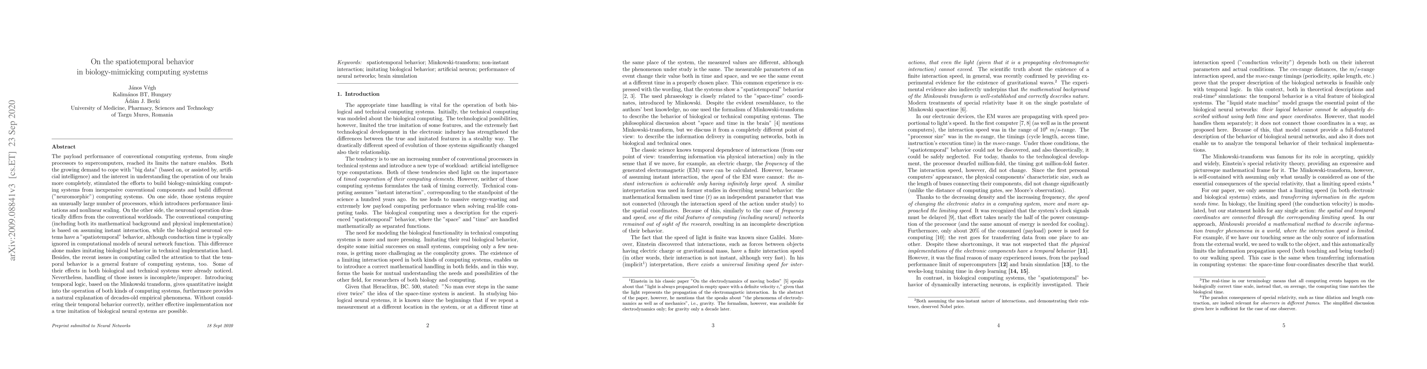 The payload performance of conventional computing systems, from single processors to supercomputers, reached its limits the nature enables. Both the growing demand to cope with "big data" (based on, or assisted by, artificial intelligence) and the interest in understanding the operation of our brain more completely, stimulated the efforts to build biology-mimicking computing systems from inexpensive conventional components and build different ("neuromorphic") computing systems. On one side, those systems require an unusually large number of processors, which introduces performance limitations and nonlinear scaling. On the other side, the neuronal operation drastically differs from the conventional workloads. The conventional computing (including both its mathematical background and physical implementation) is based on assuming instant interaction, while the biological neuronal systems have a "spatiotemporal" behavior. This difference alone makes imitating biological behavior in technical implementation hard. Besides, the recent issues in computing called the attention to that the temporal behavior is a general feature of computing systems, too. Some of their effects in both biological and technical systems were already noticed. Nevertheless, handling of those issues is incomplete/improper. Introducing temporal logic, based on the Minkowski transform, gives quantitative insight into the operation of both kinds of computing systems, furthermore provides a natural explanation of decades-old empirical phenomena. Without considering their temporal behavior correctly, neither effective implementation nor a true imitation of biological neural systems are possible.