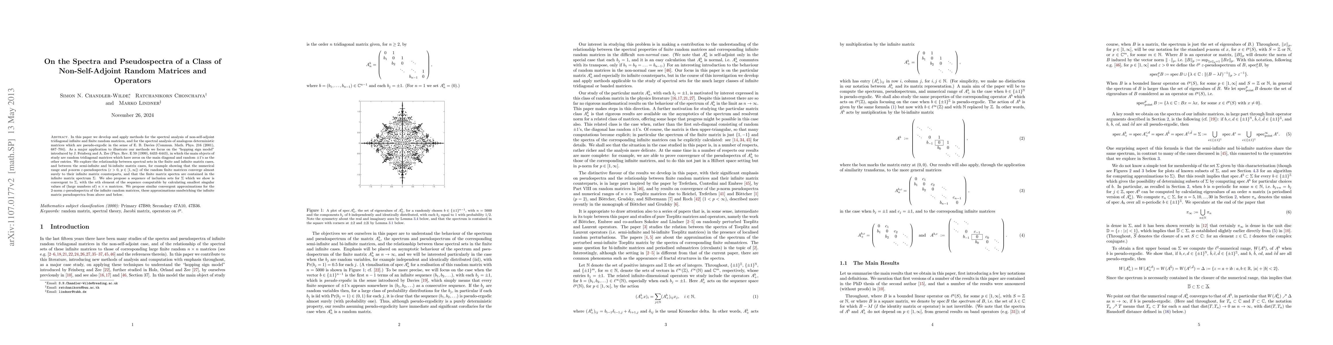 This paper develops spectral analysis methods for non-self-adjoint random tridiagonal matrices, focusing on the "hopping sign model." It demonstrates that finite matrix spectra converge to infinite matrix spectra and proposes convergent approximations for pseudospectra using singular values.
