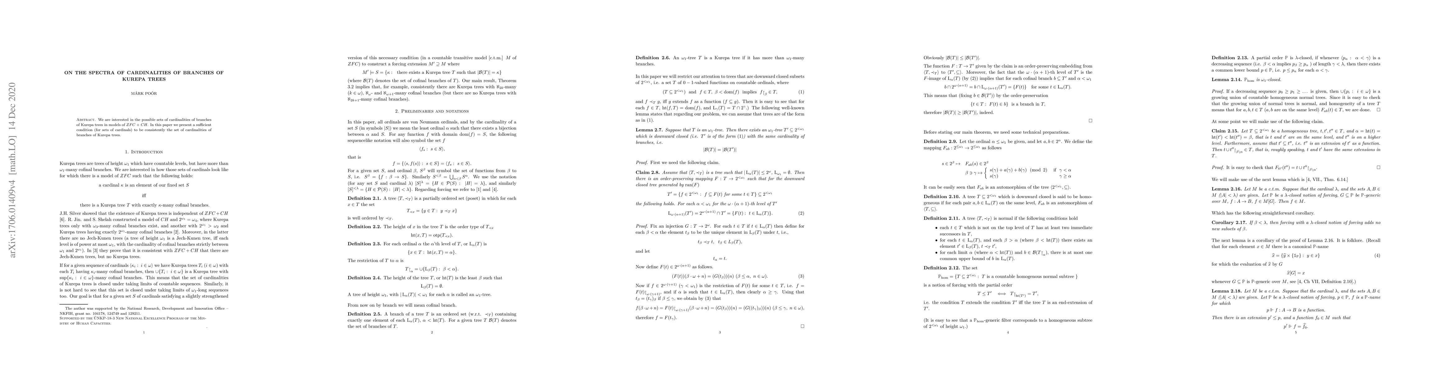 We are interested in the possible sets of cardinalities of branches of Kurepa trees in models of $ZFC$ $+$ $CH$. In this paper we present a sufficient condition (for sets of cardinals) to be consistently the set of cardinalities of branches of Kurepa trees.