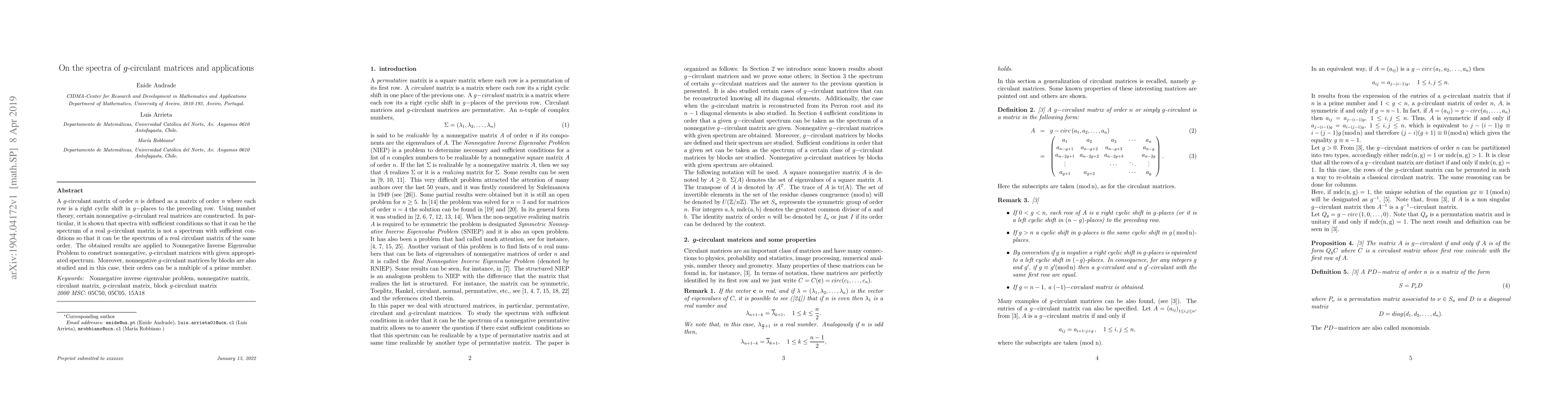 This paper explores the spectra of $g$-circulant matrices, demonstrating that certain spectra can uniquely characterize $g$-circulant matrices rather than standard circulant matrices. It applies these findings to solve the Nonnegative Inverse Eigenvalue Problem, constructing matrices with specific spectra and studying their block structures.