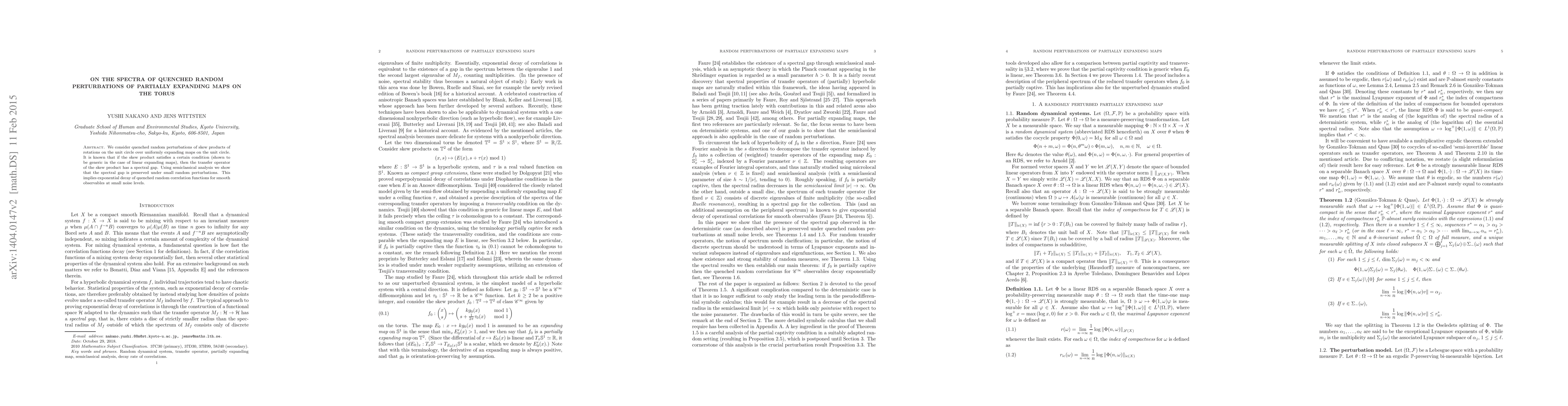 This paper investigates the spectral properties of random perturbations in skew products of rotations on the torus, demonstrating that a spectral gap is preserved under small perturbations, leading to exponential decay of correlation functions for smooth observables.