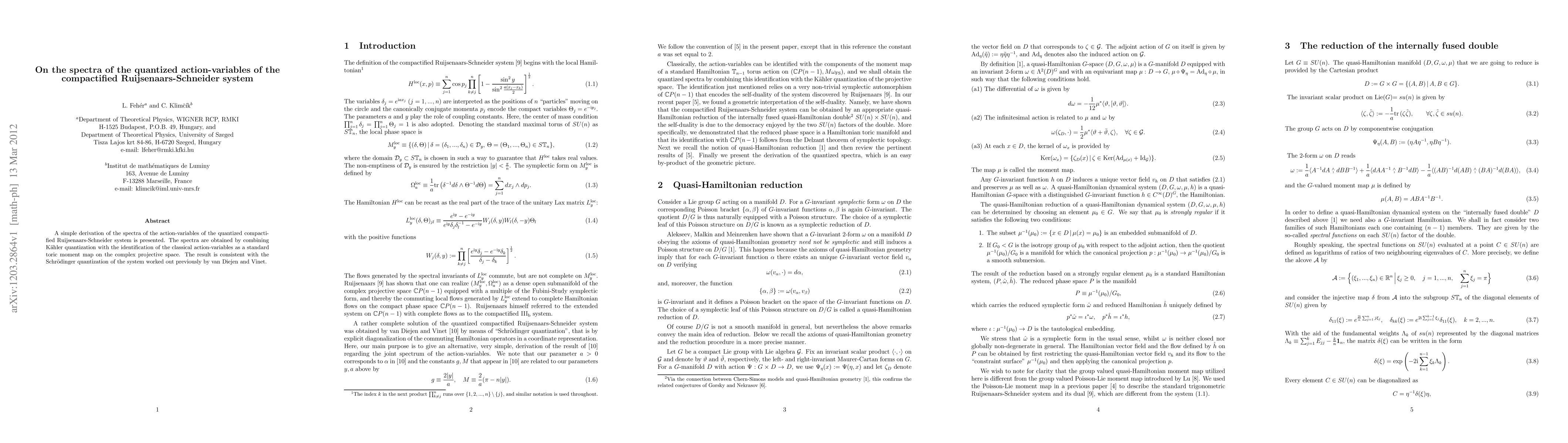 A simple derivation of the spectra of the action-variables of the quantized compactified Ruijsenaars-Schneider system is presented. The spectra are obtained by combining Kahler quantization with the identification of the classical action-variables as a standard toric moment map on the complex projective space. The result is consistent with the Schrodinger quantization of the system worked out previously by van Diejen and Vinet.