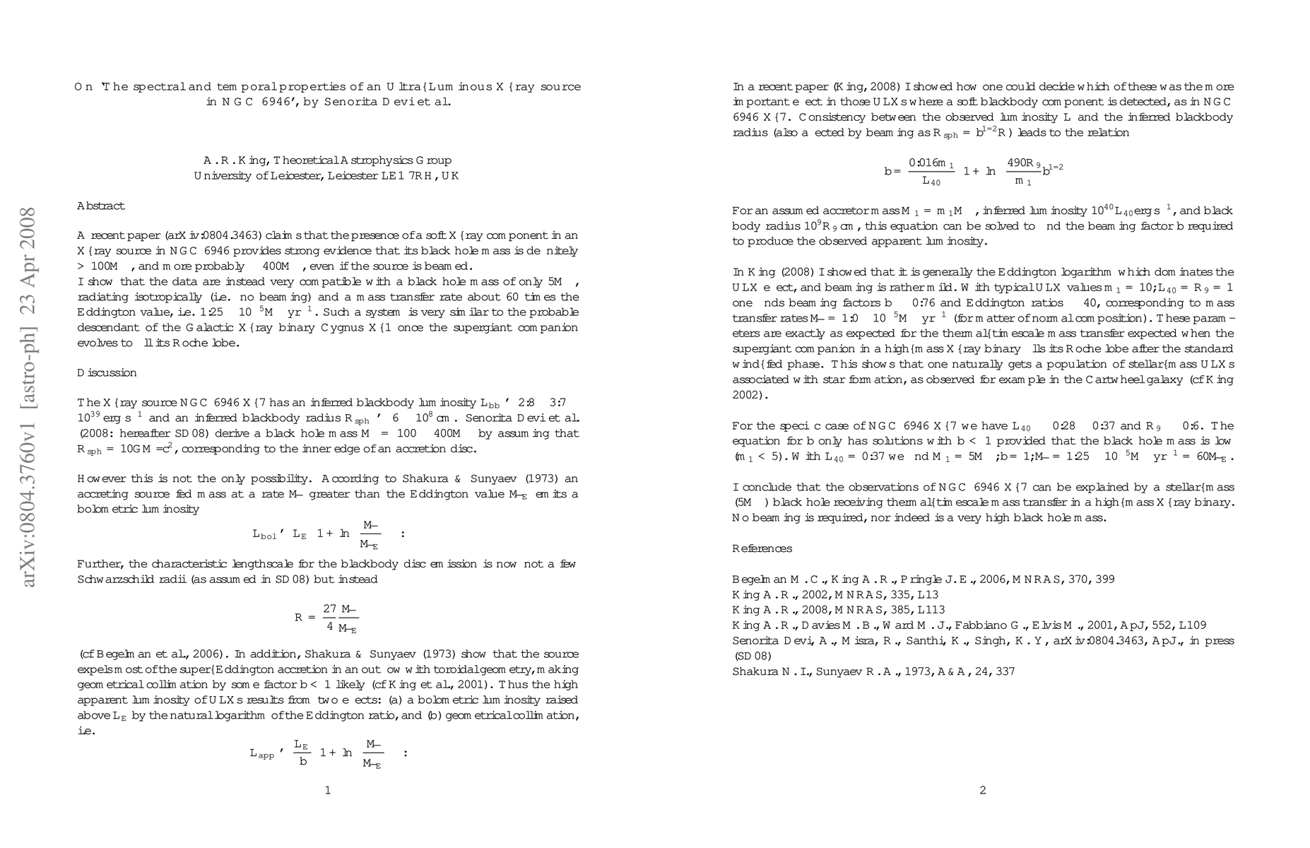 A recent paper (arXiv:0804.3463) claims that the presence of a soft X-ray component in an X-ray source in NGC 6946 provides strong evidence that its black hole mass is definitely $>100\msun$, and more probably $\sim 400\msun$, even if the source is beamed. I show that the data are instead very compatible with a black hole mass of only $5\msun$, radiating isotropically (i.e. no beaming) and a mass transfer rate about 60 times the Eddington value, i.e. $1.25 \times 10^{-5} \msun {\rm yr}^{-1}$. Such a system is very similar to the probable descendant of the Galactic X-ray binary Cygnus X--1 once the supergiant companion evolves to fill its Roche lobe.