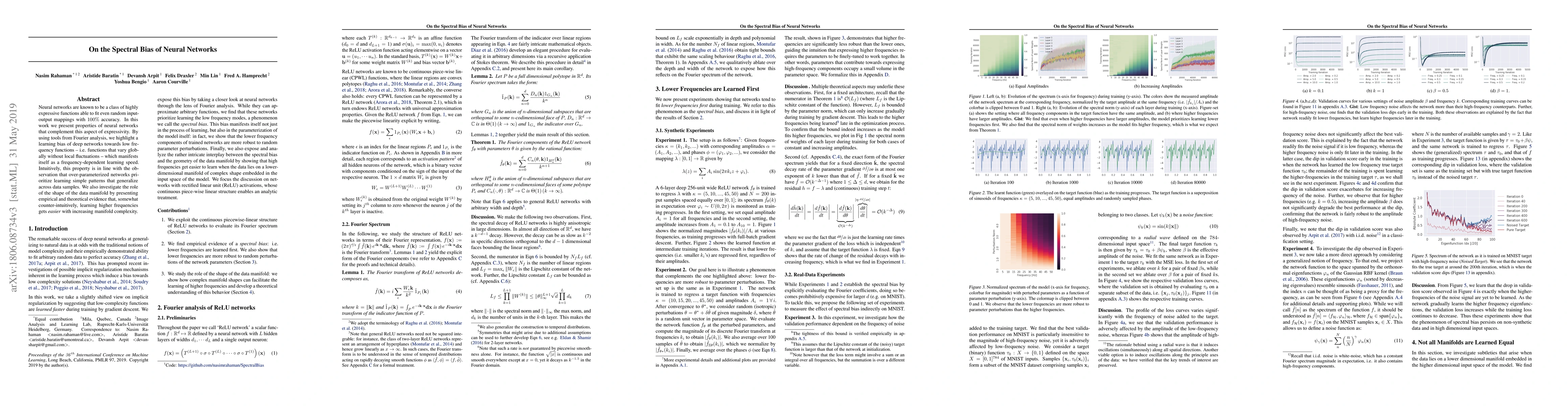 Neural networks are known to be a class of highly expressive functions able to fit even random input-output mappings with $100\%$ accuracy. In this work, we present properties of neural networks that complement this aspect of expressivity. By using tools from Fourier analysis, we show that deep ReLU networks are biased towards low frequency functions, meaning that they cannot have local fluctuations without affecting their global behavior. Intuitively, this property is in line with the observation that over-parameterized networks find simple patterns that generalize across data samples. We also investigate how the shape of the data manifold affects expressivity by showing evidence that learning high frequencies gets \emph{easier} with increasing manifold complexity, and present a theoretical understanding of this behavior. Finally, we study the robustness of the frequency components with respect to parameter perturbation, to develop the intuition that the parameters must be finely tuned to express high frequency functions.