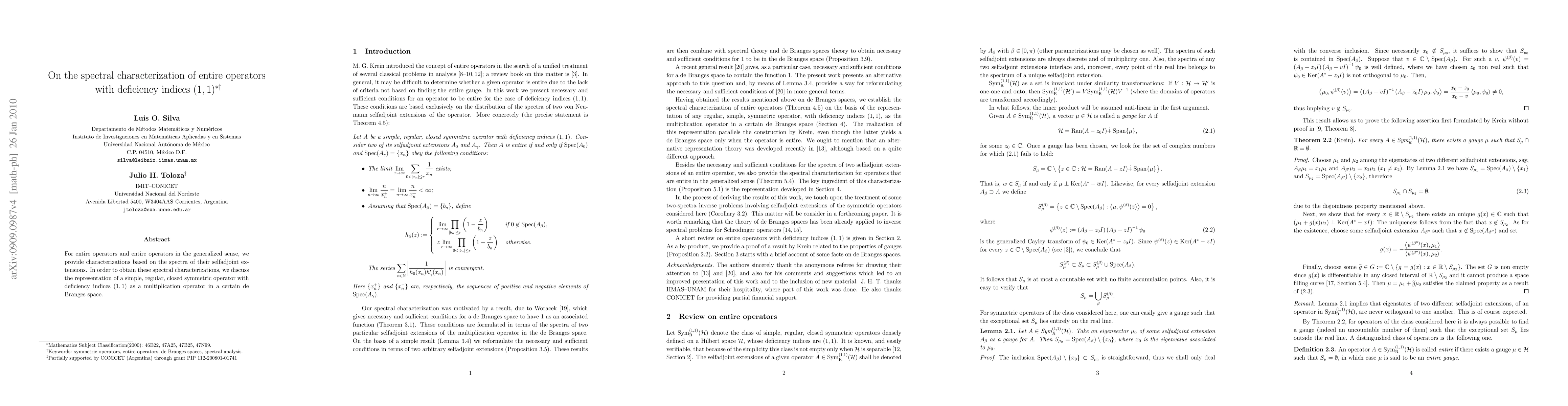 This paper characterizes entire operators with deficiency indices (1,1) through the spectra of their selfadjoint extensions. It also explores the representation of such operators as multiplication operators in de Branges spaces.