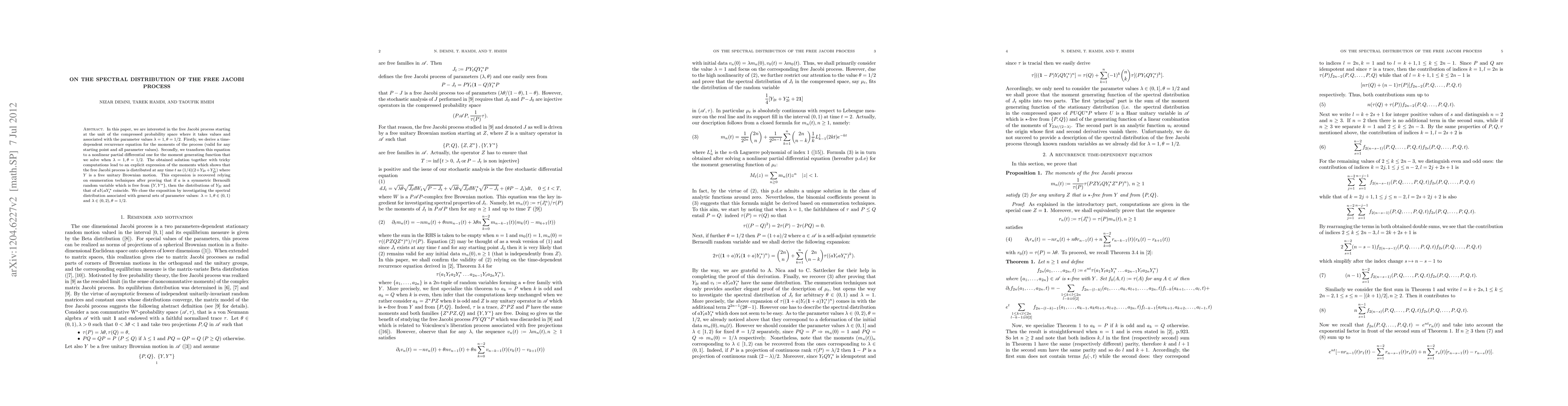 In this paper, we are interested in the free Jacobi process starting at the unit of the compressed probability space where it takes values and associated with the parameter values $\lambda=1, \theta =1/2$. Firstly, we derive a time-dependent recurrence equation for the moments of the process (valid for any starting point and all parameter values). Secondly, we transform this equation to a nonlinear partial differential one for the moment generating function that we solve when $\lambda = 1, \theta =1/2$. The obtained solution together with tricky computations lead to an explicit expression of the moments which shows that the free Jacobi process is distributed at any time $t$ as $(1/4)(2+Y_{2t}+Y_{2t}^{\star})$ where $Y$ is a free unitary Brownian motion. This expression is recovered relying on enumeration techniques after proving that if $a$ is a symmetric Bernoulli random variable which is free from $\{Y, Y^{\star}\}$, then the distributions of $Y_{2t}$ and that of $aY_taY_t^{\star}$ coincide. We close the exposition by investigating the spectral distribution associated with general sets of parameter values.