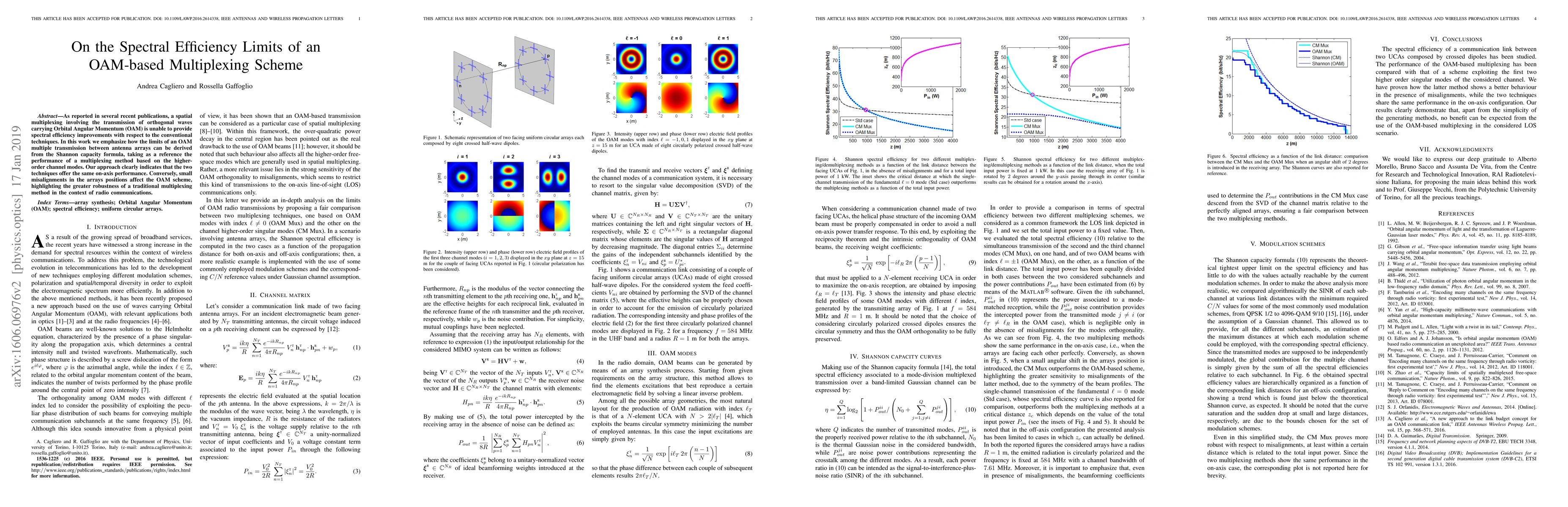This paper investigates the spectral efficiency of an OAM-based multiplexing scheme, finding that it does not outperform conventional methods in terms of spectral efficiency. It concludes that both techniques offer similar on-axis performance, but traditional methods are more robust to small misalignments.