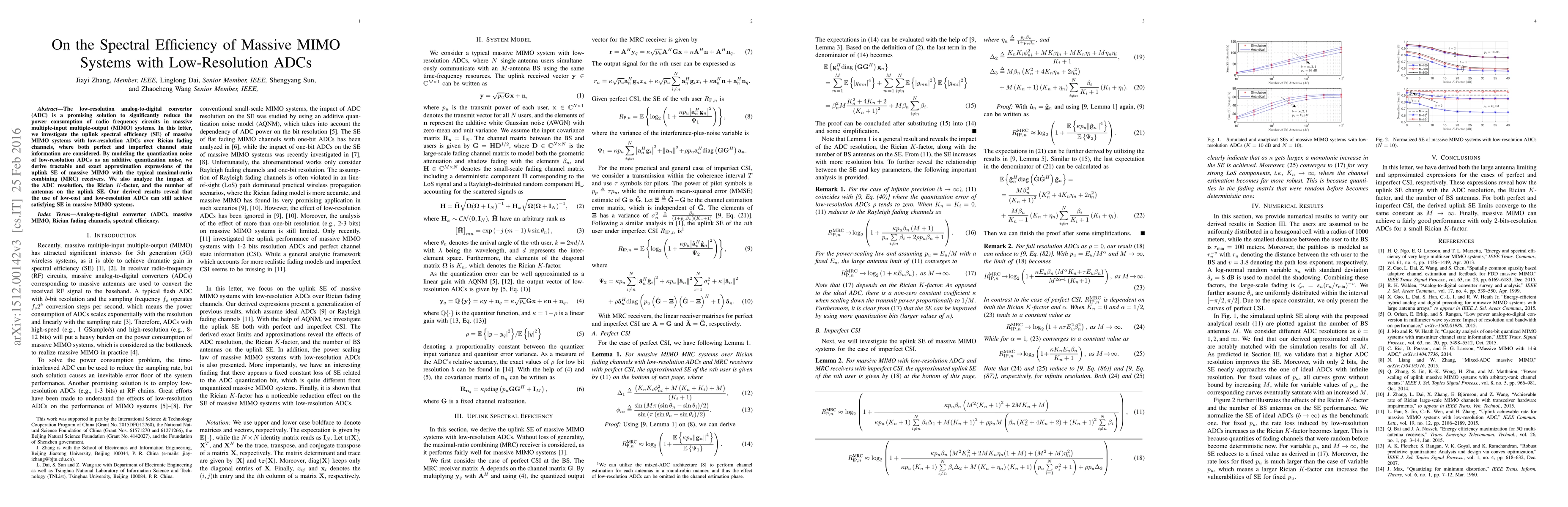 This paper investigates the spectral efficiency of massive MIMO systems using low-resolution ADCs, finding that despite reduced power consumption, satisfactory uplink performance can still be achieved. The study derives expressions for spectral efficiency under Rician fading, considering both perfect and imperfect channel state information.