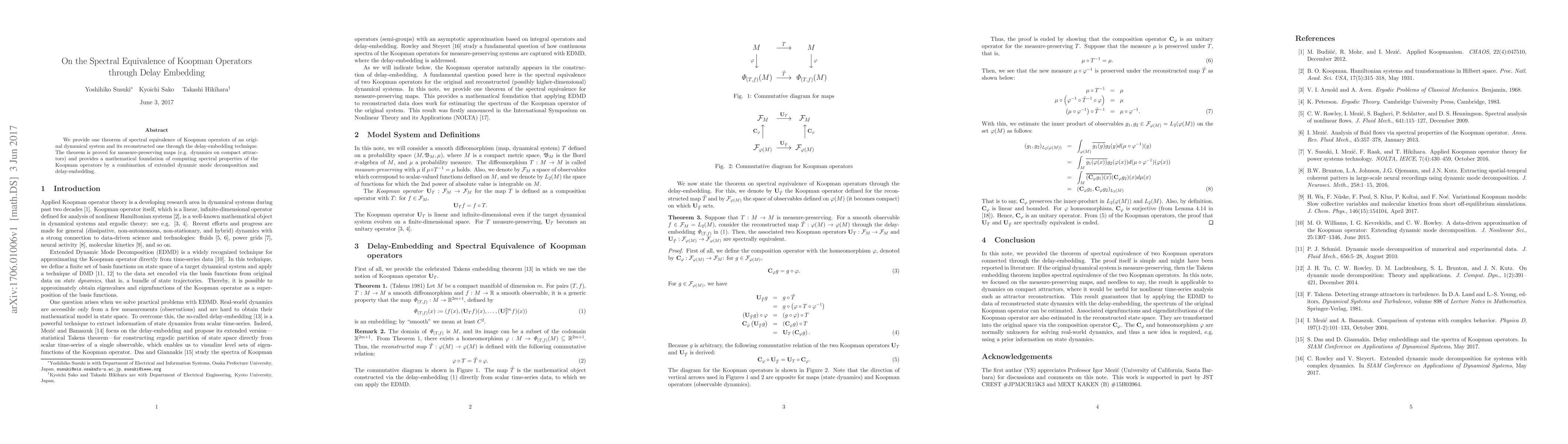 This paper proves the spectral equivalence of Koopman operators between an original dynamical system and its reconstruction via delay embedding, specifically for measure-preserving maps. It establishes a mathematical basis for computing spectral properties using extended dynamic mode decomposition combined with delay-embedding techniques.