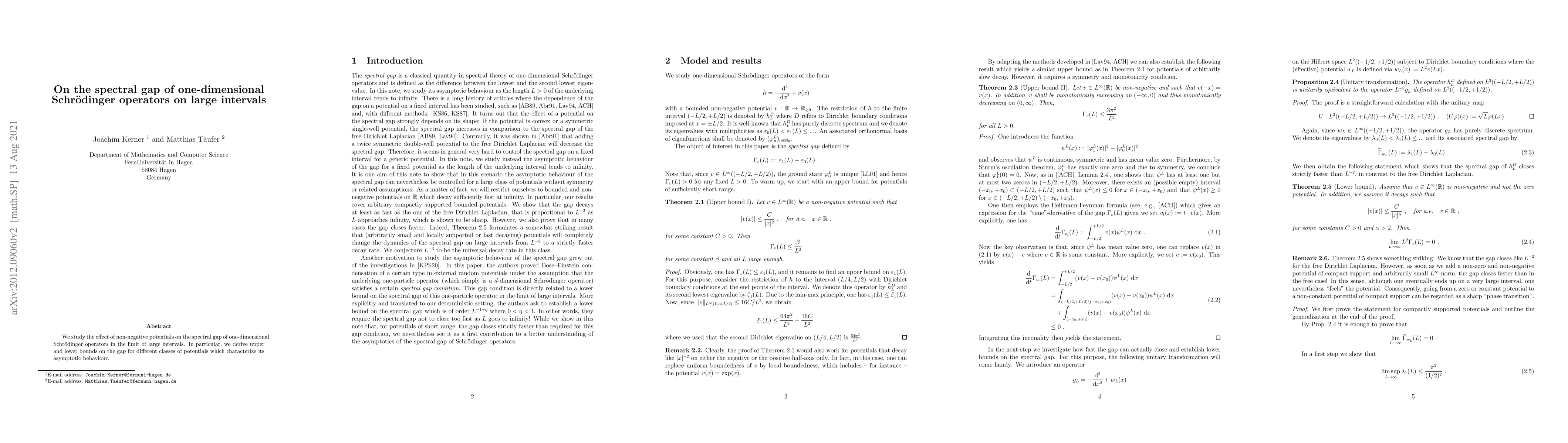 Summary: This paper investigates the influence of non-negative potentials on the spectral gap of one-dimensional Schrödinger operators over large intervals, establishing both upper and lower bounds to characterize the asymptotic behavior of the gap.