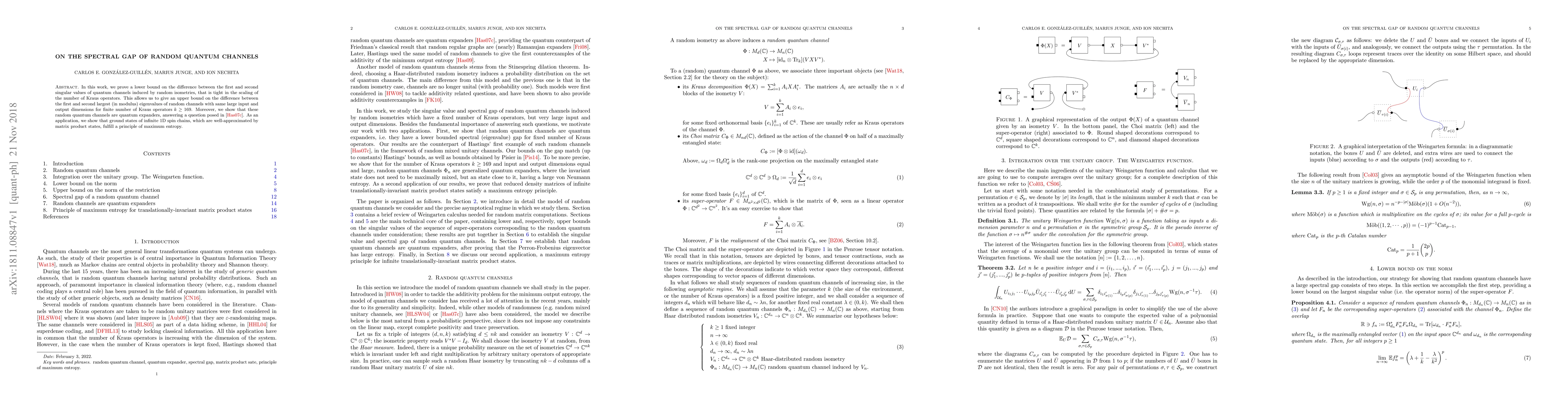 In this work, we prove a lower bound on the difference between the first and second singular values of quantum channels induced by random isometries, that is tight in the scaling of the number of Kraus operators. This allows us to give an upper bound on the difference between the first and second largest (in modulus) eigenvalues of random channels with same large input and output dimensions for finite number of Kraus operators $k\geq 169$. Moreover, we show that these random quantum channels are quantum expanders, answering a question posed by Hastings. As an application, we show that ground states of infinite 1D spin chains, which are well-approximated by matrix product states, fulfill a principle of maximum entropy.